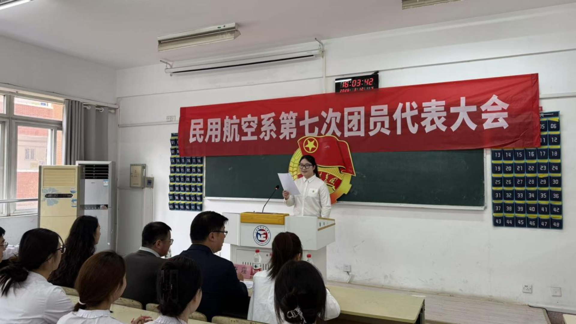 2026年3月12日,民用航空系第七次团员代表大会在2205教室隆重召开。院团委书记黄晓帆、民用航空系党支部书记查理、经济与管理系团总支书记倪冰慧、民用航空系团总支书记陈瑶瑶出席会议,共50名团员代表参加开幕式。开幕式由主席团成员何辰怡主持。