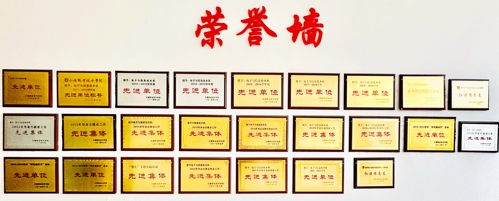 近年来我系取得丰硕的成果:2008~2009学年度英国上市公司365先进单位;2011~2012年度院级先进单位;2012年院级教科研工作先进集体;2012年度院毕业生就业工作先进集体;2013年院级毕业生就业工作先进集体;2013~2014年度院先进单位;2015年院级毕业生就业工作先进集体;2015~2016学年院先进单位;2016年院级毕业生就业工作先进集体; 2016年获评江苏省教育工作先进集体;2017~2018年院级先进单位;2021~2022年院级先进单位;2025年江苏省“工人先锋号”;电工电子实验中心获批为江苏省高等学校示范实验中心;电子信息工程技术专业获批为江苏省特色专业;电子信息技术实训基地获批为江苏省省级高等职业教育实训基地;电子信息工程技术专业群获批成为江苏省“十二五”省高校重点专业;电子信息工程技术专业为省高水平专业建设专业;无人机应用技术专业是省内最早开设,现为院重点建设专业;计算机网络技术专业为院级重点专业。“建立校企合作长效机制,打造网络人才实训平台”教学成果入选教育部十大推荐案例。