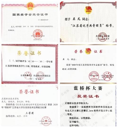 他每天穿梭于教室和图书馆,在保证专业成绩名列前茅的同时,在施莹、苏娜老师的指导下,主持了江苏省大学生实践创新训练项目——《基于微信小程序的立FLAG交互系统》,并在省级期刊上发表了相关论文;软件设计作品《校园流浪猫监测系统》在大学生计算机设计大赛上,取得了优胜奖;接连斩获了“蓝桥杯”软件人才大赛二等奖、“领航杯”大学生信息技术应用能力竞赛三等奖等专业竞赛奖项。经过他不懈的努力,获得了国家奖学金荣誉称号,沉甸甸的“国家奖学金荣誉证书”镌刻着他努力的点滴,浸透着他奋斗的汗水,鞭策着他前进的信念。