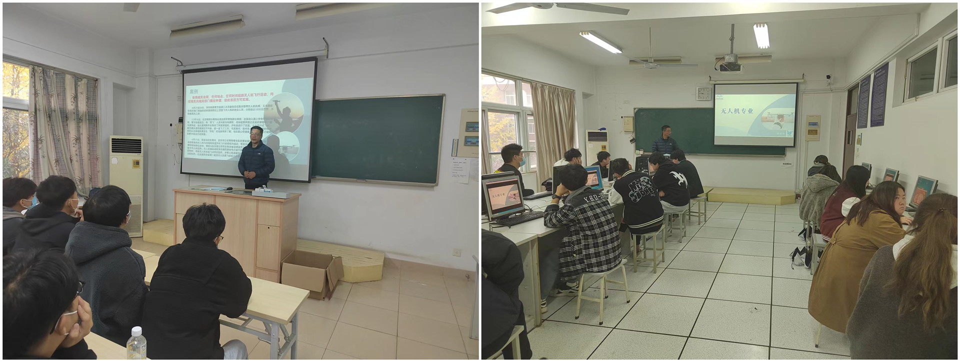 讲座上王剑从无人机市场前景分析、合法飞行和技能培养三个方面为2022级新生们进行讲授,引导学理清专业脉络,提高学习兴趣,尽快适应本专业的学习生活。赵筱捷为大一、大二无人机专业学生详细分析了民用无人机的行业应用,从行业未来发展趋势、技术发展趋势和市场发展趋势三个方面深入浅出的解析了无人机在不同行业、不同环境下的应用与发展,让同学们对自己未来的就业方向有了更深入了解。