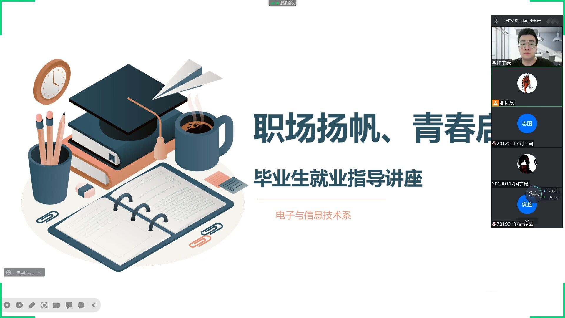 为进一步做好2023届毕业生就业指导服务工作,对毕业生提供全方位、多渠道、分层次地就业指导。2022年11月21日,电子与信息技术系通过腾讯会议线上举办主题为“职场扬帆,青春启航”的就业指导讲座暨线上企业招聘宣讲会。我系优秀毕业生、南京上宇禾科技有限公司人事部主管徐宇辰应邀参加,来自电子与信息技术系电子信息工程技术和云计算技术与应用两个专业的50余名学生参加。