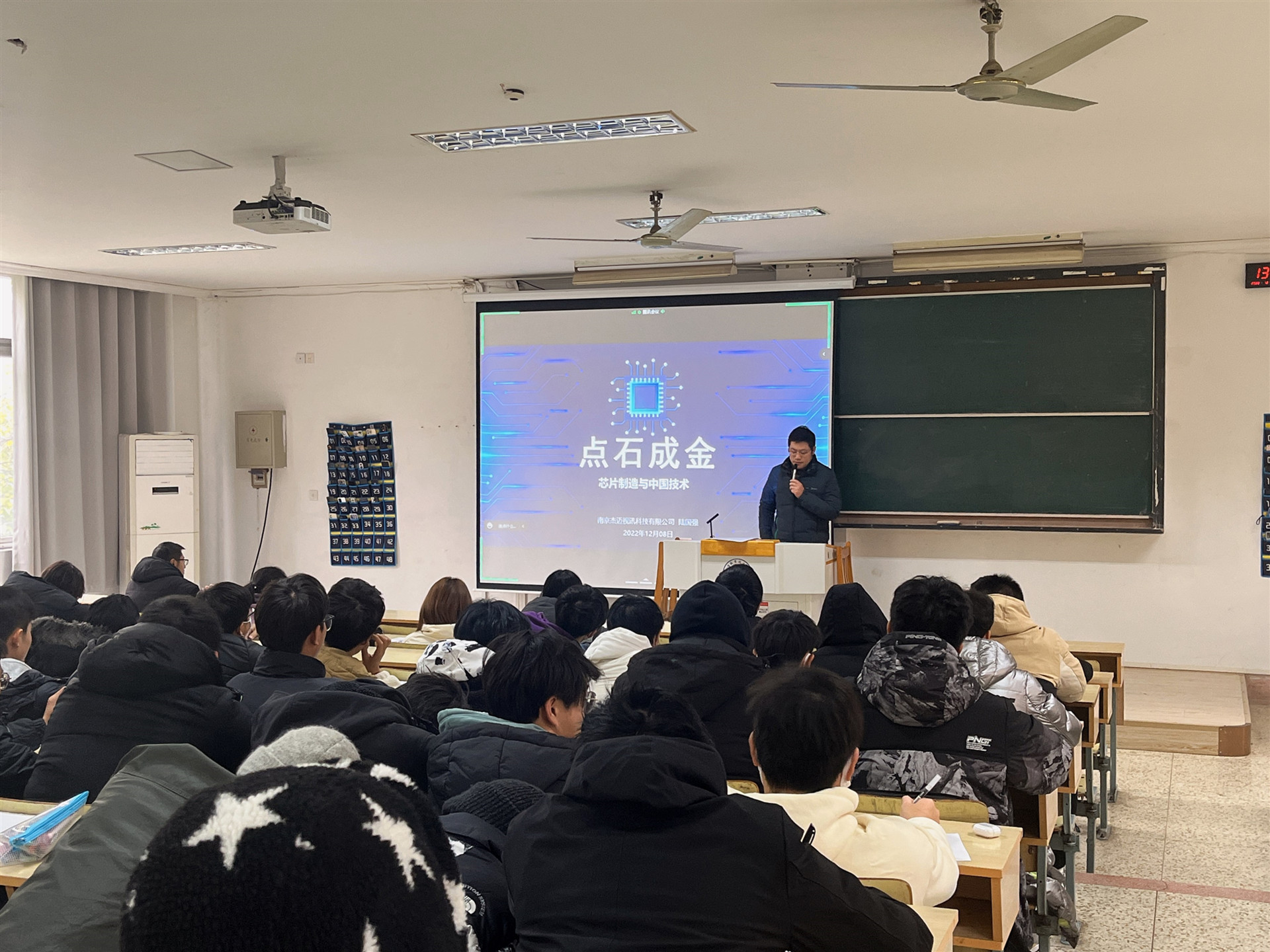 陆国强以《点石成金——芯片制造与中国技术》为主题,以电子行业目前的发展为背景,从专业领域的角度出发,介绍了突围“卡脖子”难题下国产芯片必经的3个阶段,他结合习近平总书记在二十大报告中针对科教兴国、人才强国指出的三个“战略”、四个“新”,鼓励同学们争做有理想、敢担当、能吃苦、能创新的新时代奋斗者。