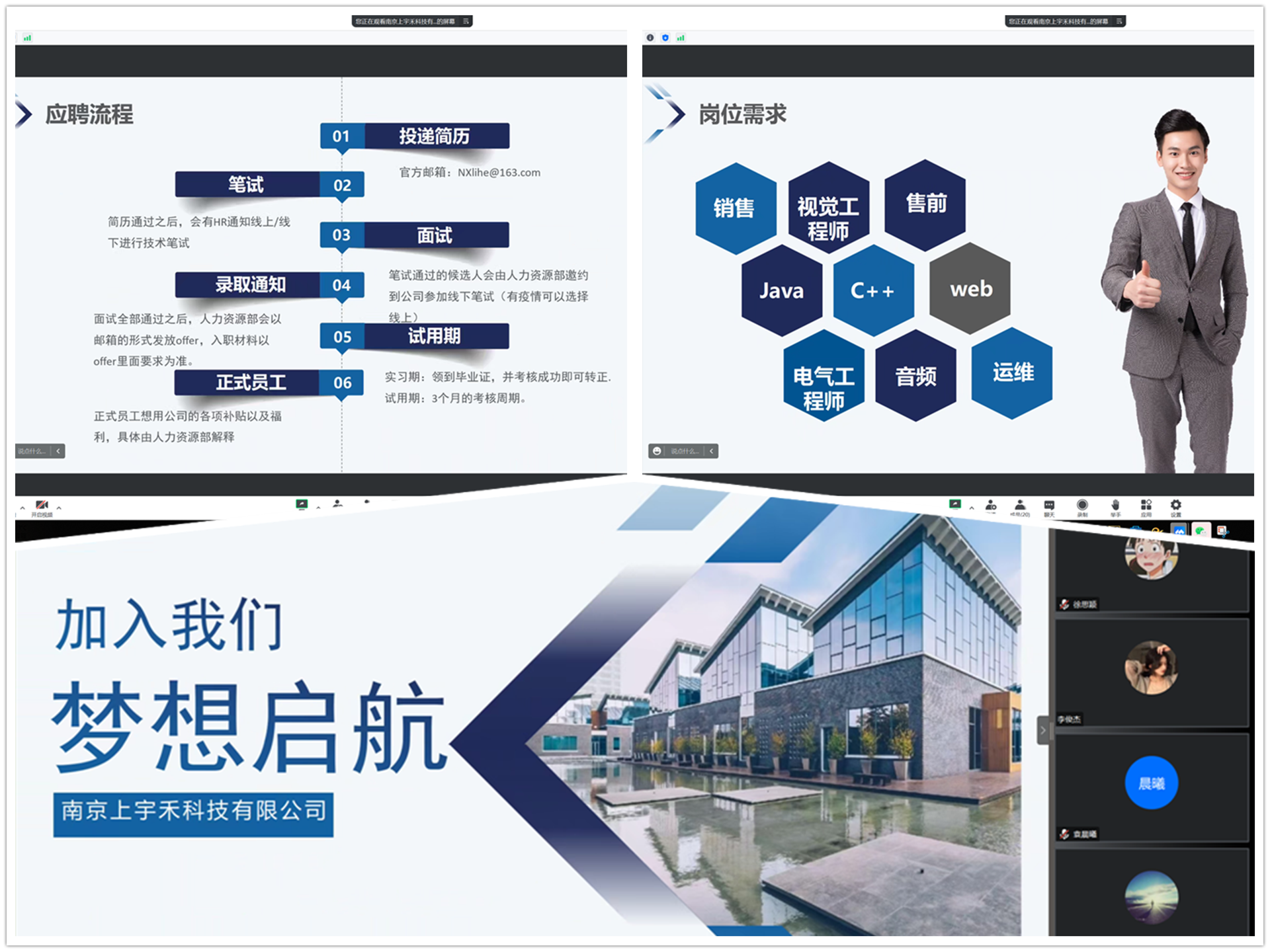 为调动电信系2023届毕业生就业积极性,拓宽就业渠道,帮助学生成功就业,近日电信系邀请南京上宇禾科技有限公司、南京讯超科技有限公司、南京中浩信息科技有限公司等知名企业通过腾讯会议平台举行2023届毕业生线上就业招聘宣讲会。