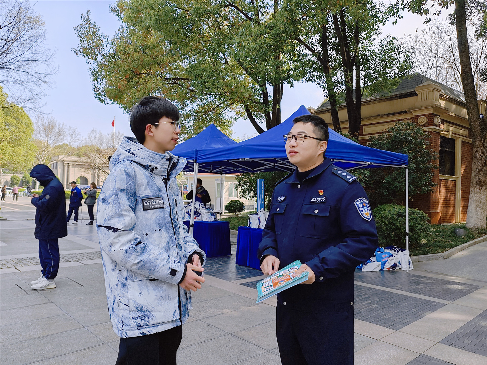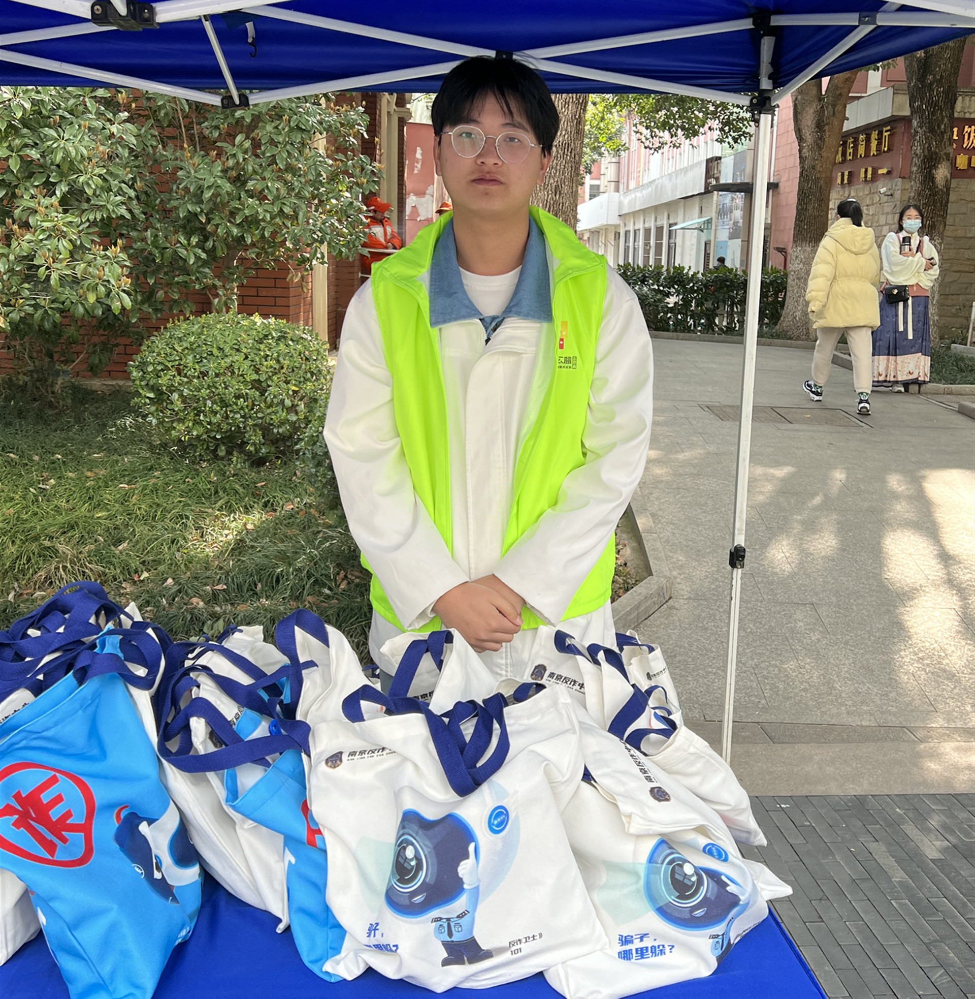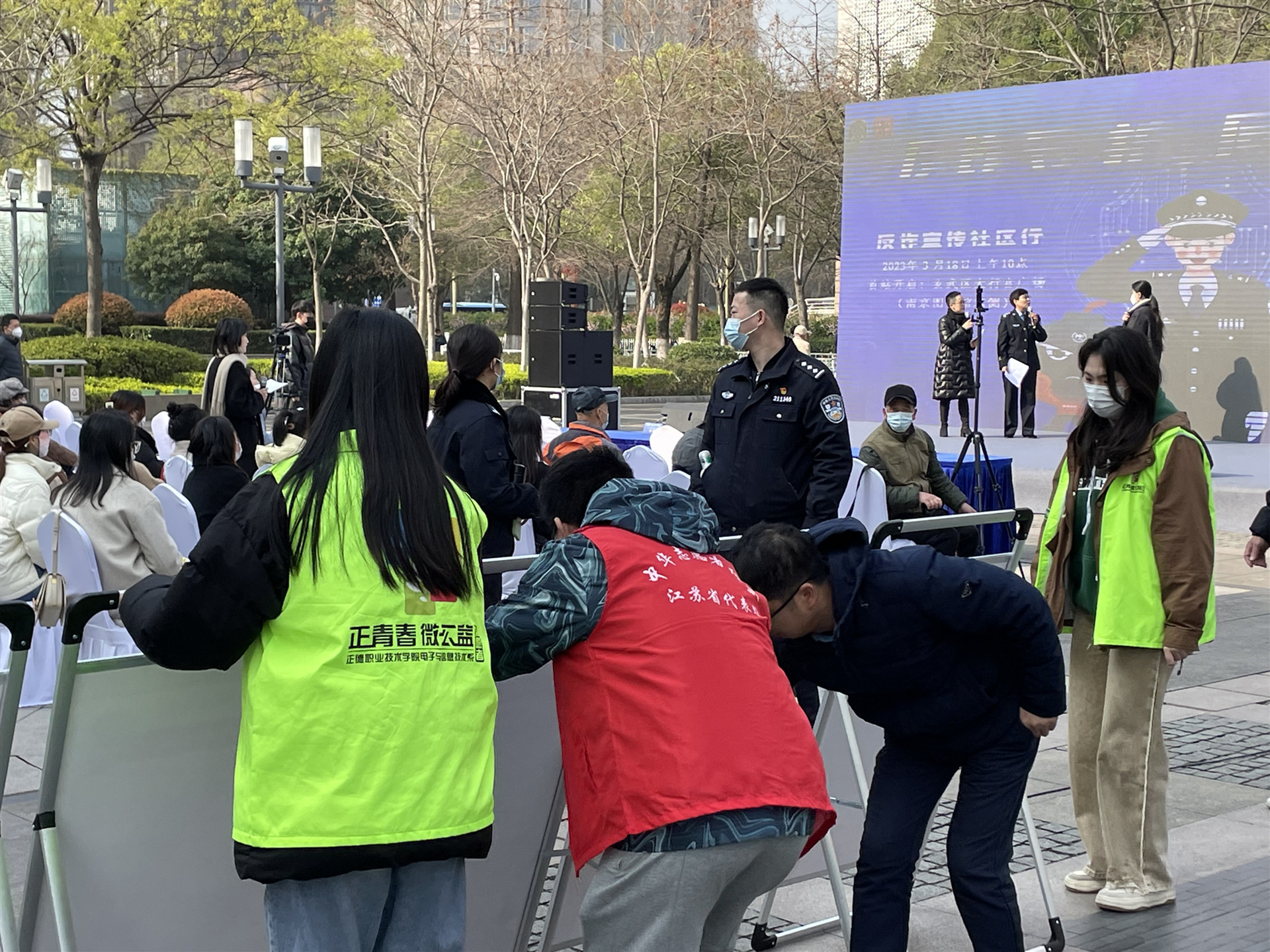 活动开始前,志愿者们就已经来到大行宫广场协助场地布置。反诈中心民警向我系志愿者简要解读了《反电诈法》的相关条例,并以辖区内的实际案件为例进行生动讲解,提醒居民不轻信、不刷单、不汇款,远离电信网络诈骗。