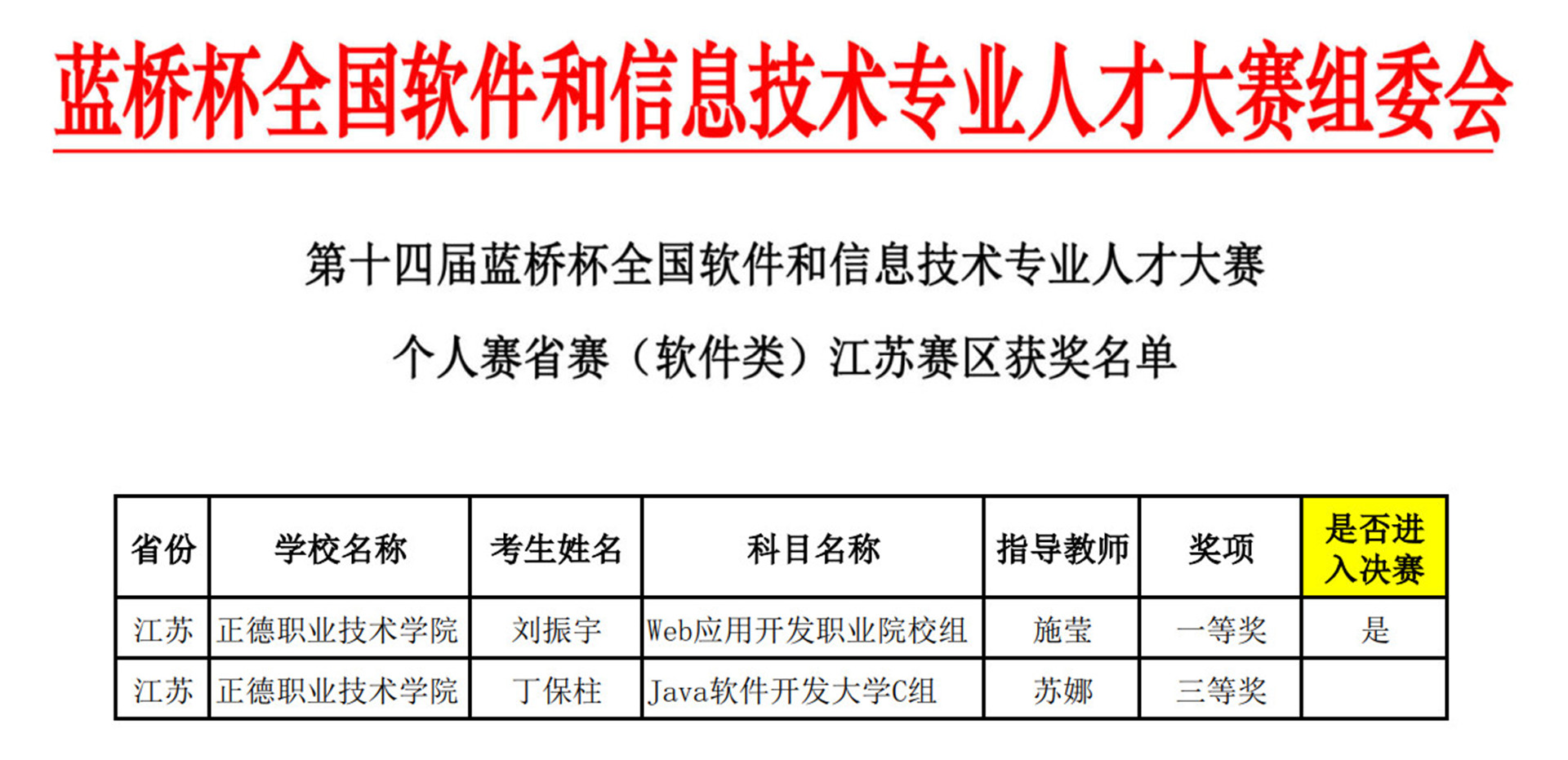 在第十四届“蓝桥杯”个人赛省赛(软件类)江苏赛区中,电子与信息技术系软件技术专业2021级学生刘振宇获省级一等奖、丁保柱获省级三等奖。其中,Web应用开发项目为我院首次参赛,获得历史性的突破,并闯入全国总决赛。