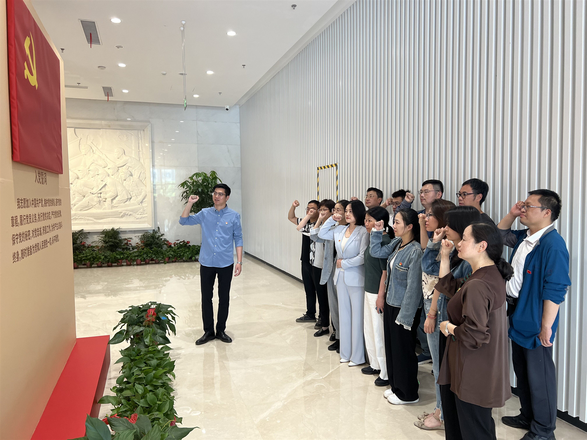 纪念厅内,支部书记赵欣带领支部全体党员重温入党誓词。“我志愿加入中国共产党……随时准备为党和人民牺牲一切,永不叛党。”铿锵恢宏的誓词,强烈震撼着在场的每一位党员,声音铿锵有力发自肺腑,表达了支部全体党员对中国共产党的无限忠诚。