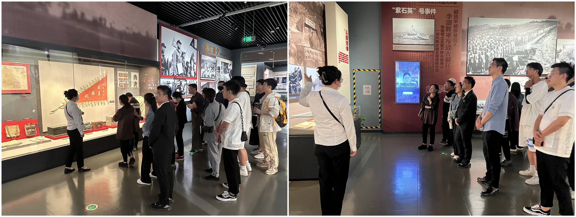 在渡江胜利纪念馆讲解员的带领下,大家参观了“天翻地覆慨而慷——渡江战役胜利暨南京解放展”。展览共包含“运筹帷幄,坚决‘打过长江去’”、“决战千里,百万雄师过大江”、“军民团结,接管城市开新局”、“革命到底, 宜将剩勇追穷寇”和“见证胜利,渡江精神世代传”五个部分,从展厅中陈列的文物、照片与文字中,大家深切感受那段革命历史,深入了解革命先辈的英雄事迹,感受到中国人民解放军在中国共产党的正确领导下,横渡长江解放南京,取得渡江战役胜利的雄壮激荡。