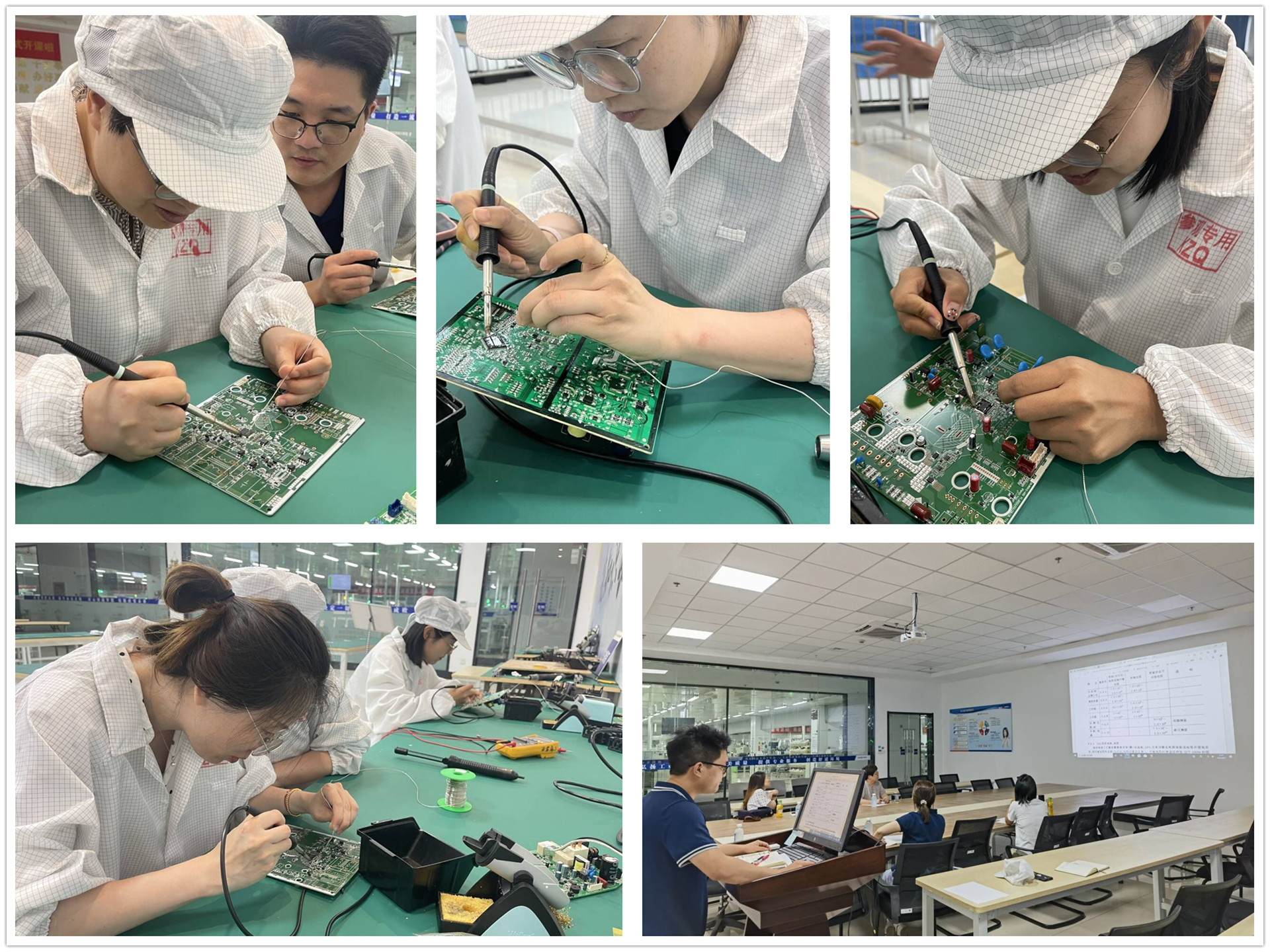 本次技能专项训练分为理论和实践两部分。理论学习中,教师们深入学习了静电防护、接插线工艺以及焊接工艺规范等内容;在生产线上重点观摩产品检测及维修技术,了解电子测量知识点在生产线的实际应用。实践学习中,教师们重点练习了集成芯片的拖焊技术,同时就点焊技术的心得进行交流,此次培训也是校企共建课程《电子测量技术》教学团队的一次深度交流和磨合。