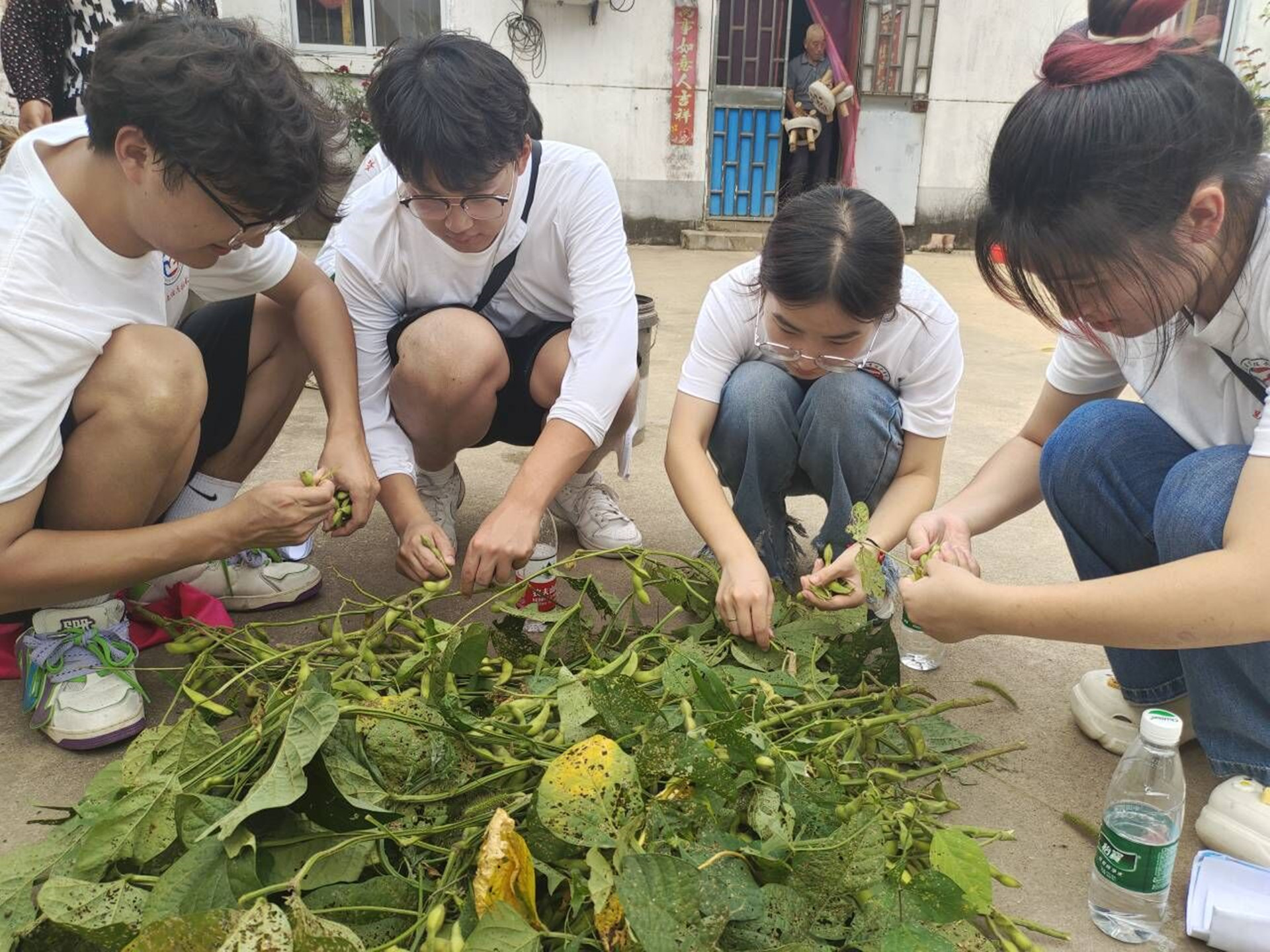 “您坐车就好,我们步行过去”,在村民的带领下,实践团走进田地间,积极帮助采摘毛豆,自告奋勇搬运稻草。阳光下,实践团成员将田间的一捧毛豆摘进手中,送入农户手心里。