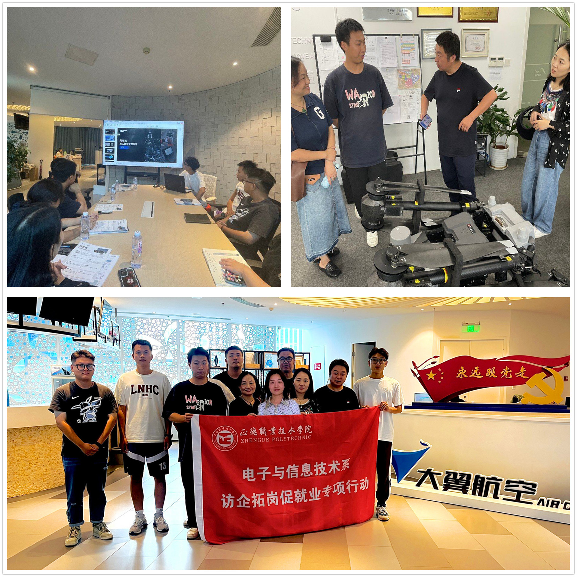 为积极拓宽毕业生和用人单位沟通渠道,搭建供需交流平台,推动毕业生充分、高质量就业,9月18日下午,电子与信息技术系副主任(主持工作)刘佳带队赴南京大翼航空科技有限公司(以下简称“大翼航空”)开展访企拓岗活动。
