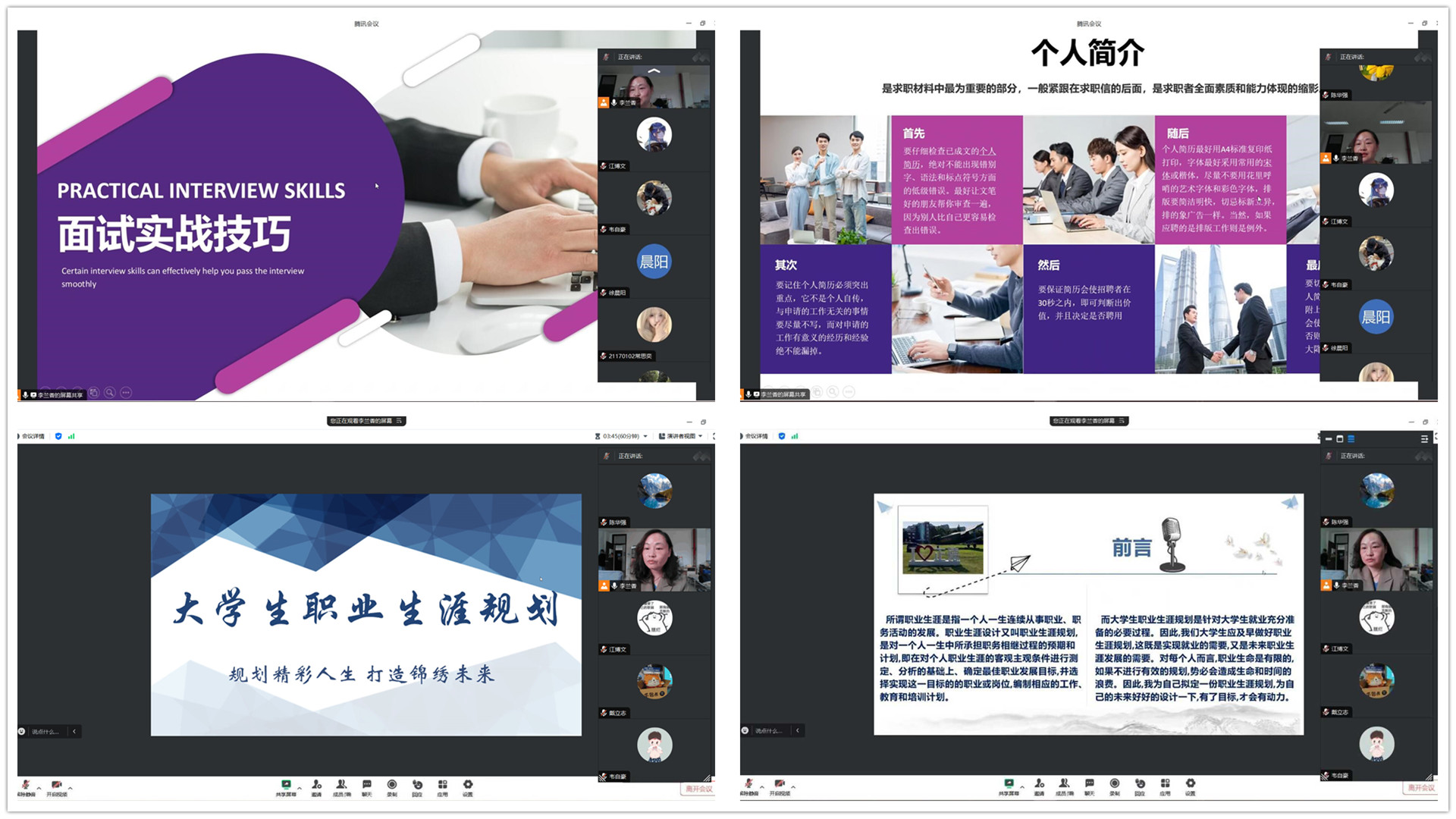 会议伊始,李兰香简要讲述生涯规划的意义,帮助同学们了解自我、把握环境、应对挑战,转变职业观念,她指出大三学生应及早开始职业规划,在大学生活与社会实践的交叉融合中化平台为机遇,化理论为实践,明确职业目标。围绕大学与职场的密切关系,李兰香生动解读了职业生涯规划的概念、意义与价值,向同学们讲解“求职材料”的准备等,分享面试技巧。