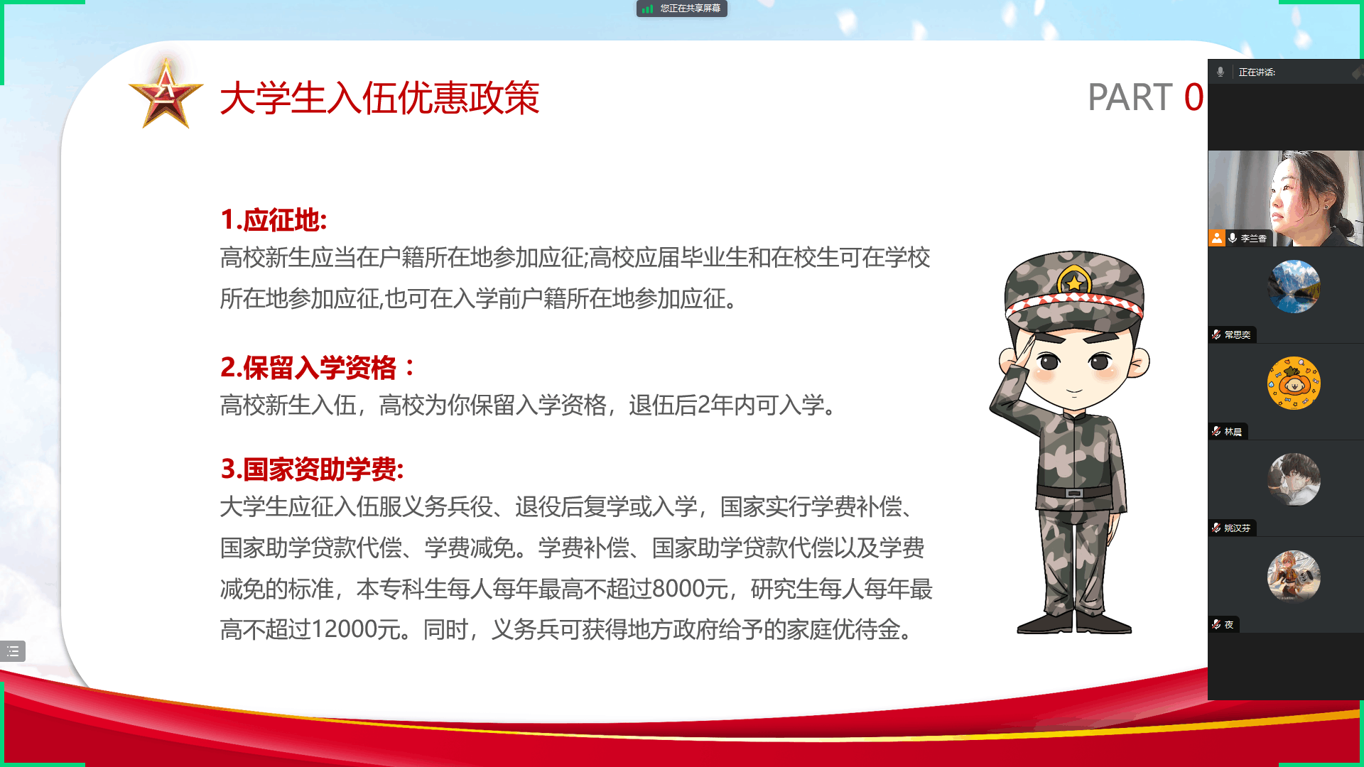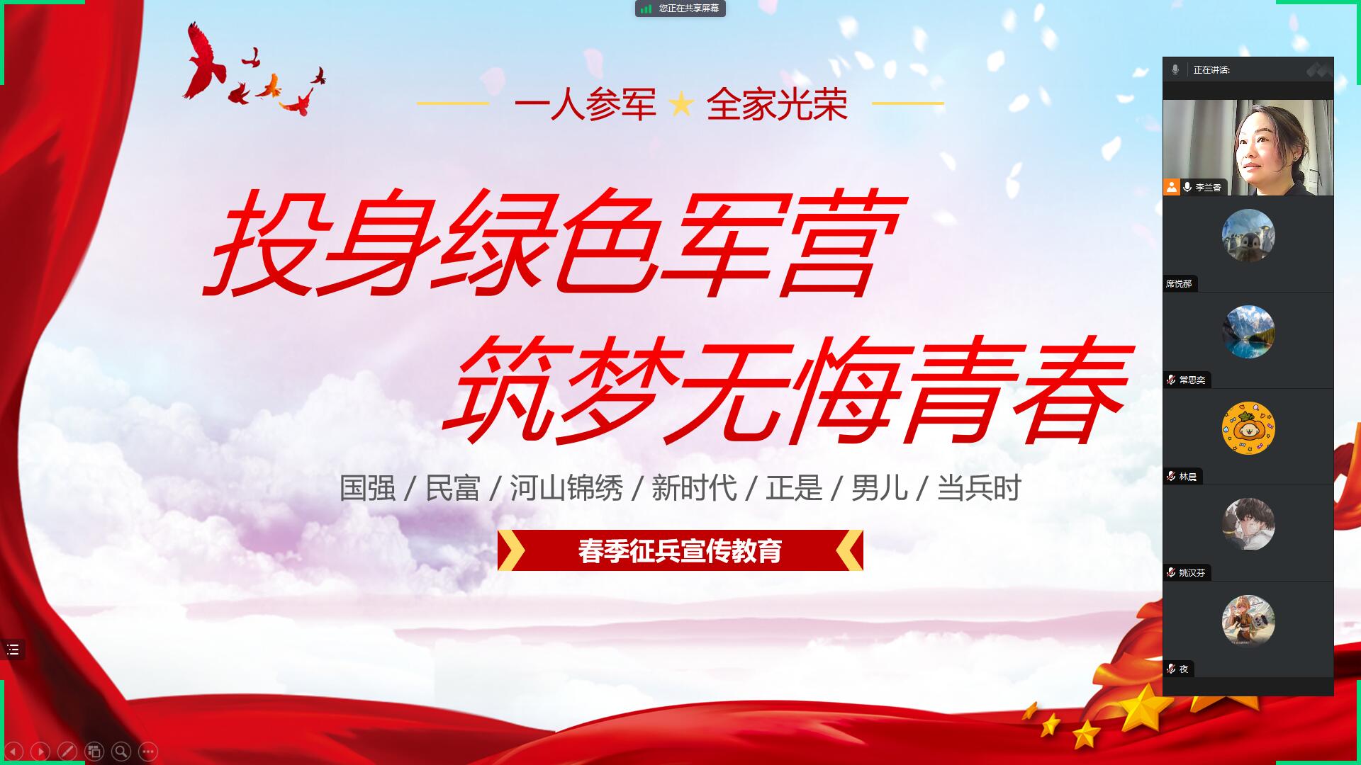 为做好2024届毕业生就业工作,进一步加强征兵工作动员力度,全力以赴把就业和征兵工作落到实处,近日,电子与信息技术系通过腾讯会议线上召开2024届毕业生就业推进暨征兵政策宣讲主题班会。会议由辅导员李兰香主持,2024届毕业生参加此次班会。