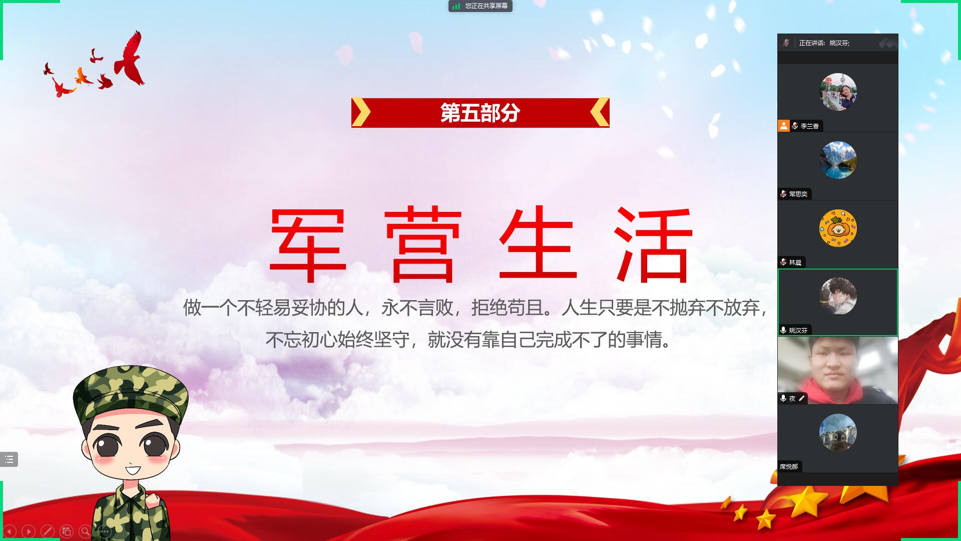 会上,李兰香重点对征兵政策进行了详细解读,使同学们更加深入了解针对大学生入伍的优待政策和要求,将宣传动员与思想教育、政策解读、职业发展、就业指导有机结合起来。部队是一个磨炼人、锻造人的大熔炉,部队经历是同学们一生宝贵的财富,人生最美是军旅,甘洒热血写风流。退伍军人211701班冯王祥受邀给同学们介绍了军营生活,他鼓励大家将个人理想融入到强国梦、强军梦中去,携笔从戎,积极踊跃报名参军,到部队去磨练自己。