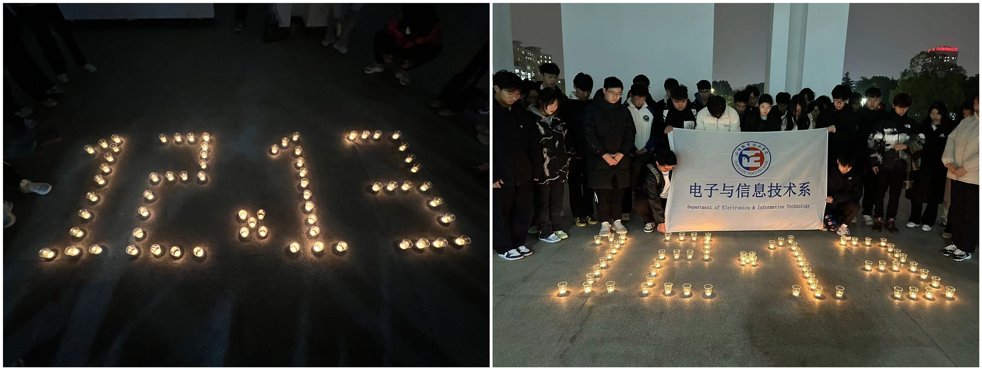 12月13日18点30分,电信系学生在创新楼广场用烛光向遇难同胞默哀。大家神情严肃的点燃蜡烛,有序的摆成“12.13”日期的样式。看着在风中摇曳的烛光,不禁回想起86年前那场令所有中华儿女愤慨的大屠杀,也想起如今,中华民族任人宰割、饱受欺凌的时代已经一去不复返,血脉的守护和赓续在中国共产觉的带领下,我们迎来了从站起来、富起来到强起来的伟大飞跃。最后,电信系学生面向蜡烛集体低头默哀。