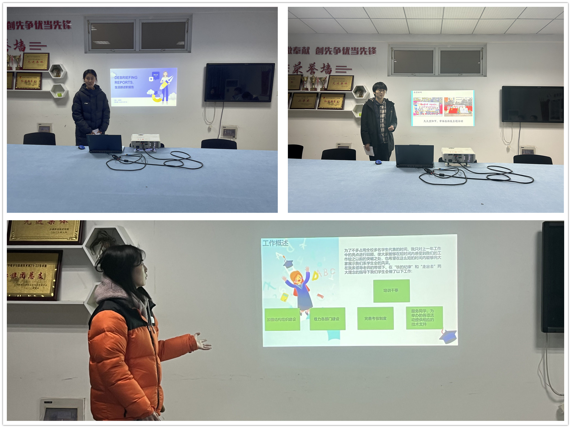 首先,电信系学生会各部门负责学生认真总结了上学年的工作,详细展示了各自工作的完成情况及所取得的成绩,并就今后工作的开展方向做汇报。随后由系学生会执行主席贡泽阳回顾了本学期学生会的组织活动情况,对本学期学生会所取得的成果进行总结,并提出今后的改进措施和工作计划。