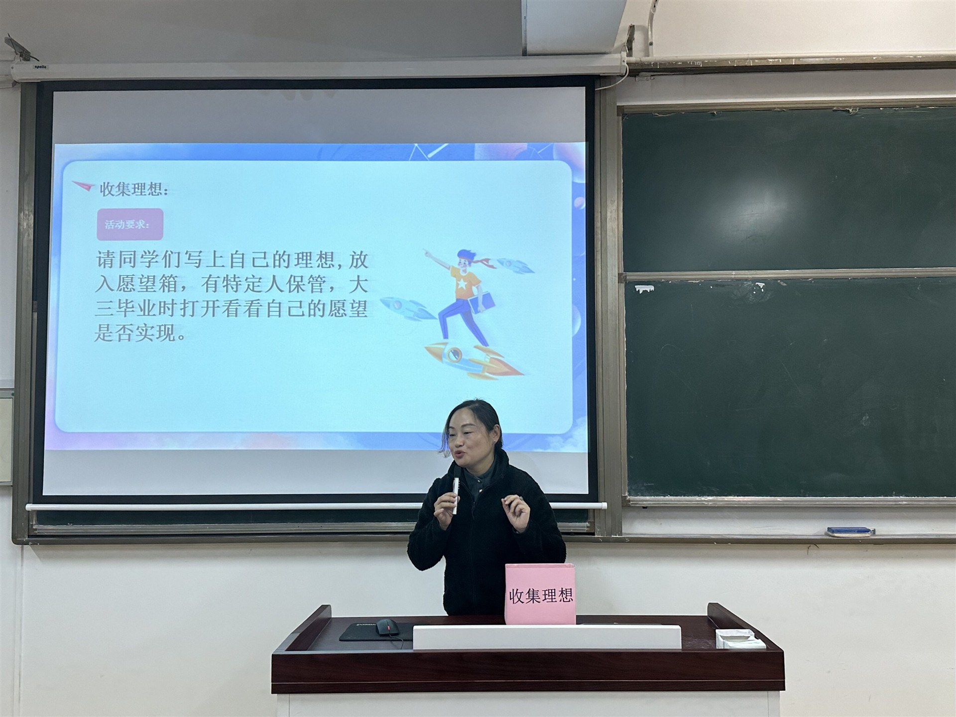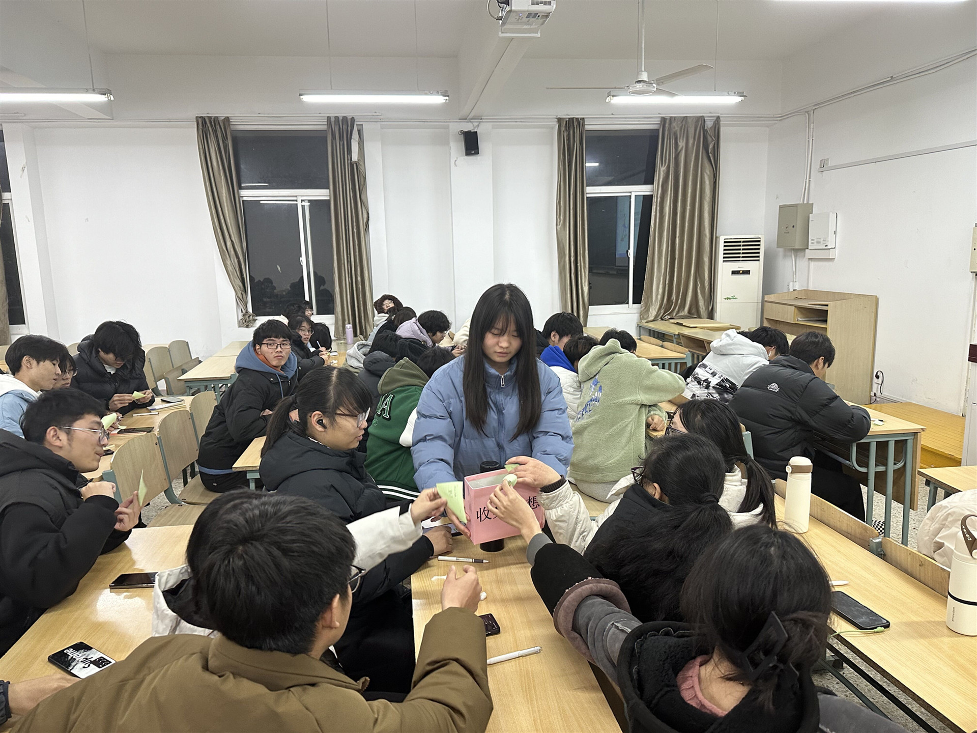 为了让同学们更好地表达自己的理想,李兰香为每位参与同学分发了便利贴。在便利贴上,同学们写下了自己对大学三年的理想与期许。最后,2023级学生李萌萌代表全体学生将所有的便利贴收集到心愿箱并带回保管,以便在大三毕业时共同回顾并检验自己的愿望是否得以实现。