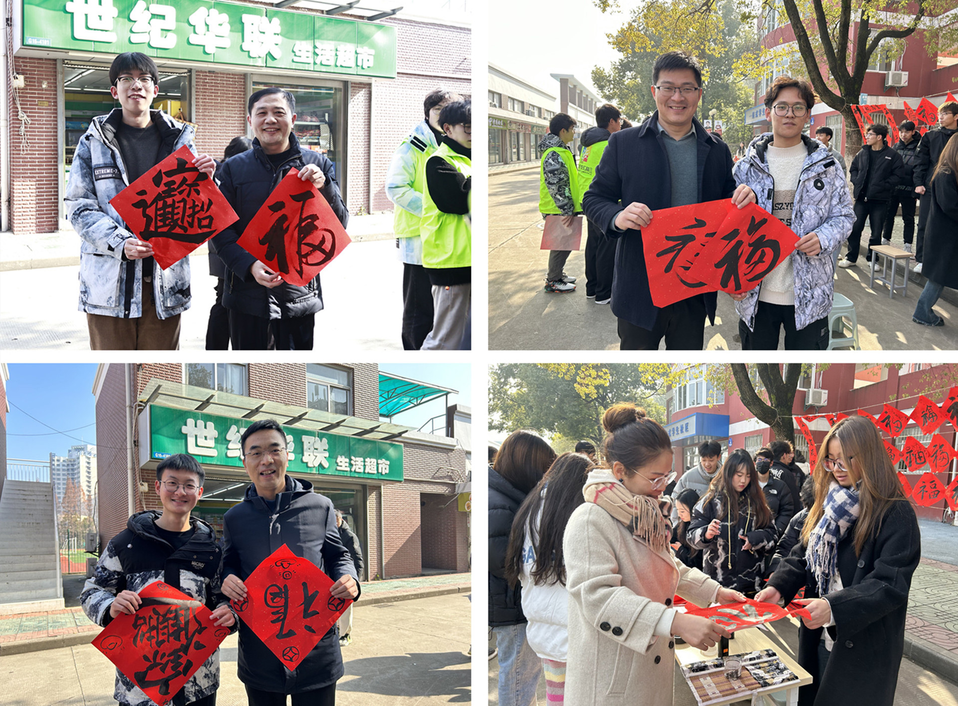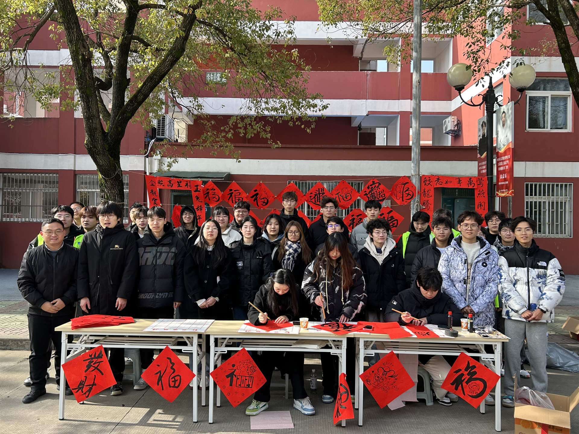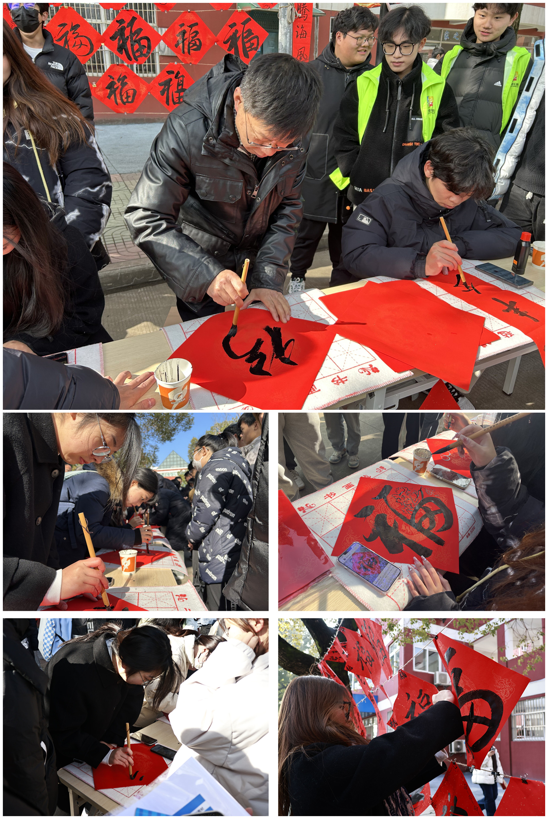 阵阵墨香指尖流,幽幽韵味心脾沁。在学院主干道一侧,春联纸、毛笔和砚台整齐地摆放在桌子上,赤红的纸张渲染着浓浓的“迎春”氛围。各系师生热情挥毫泼墨,一幅幅笔法精湛,饱含浓浓喜庆祥和气息的对联和“龙福”字跃然纸上,墨香情浓。