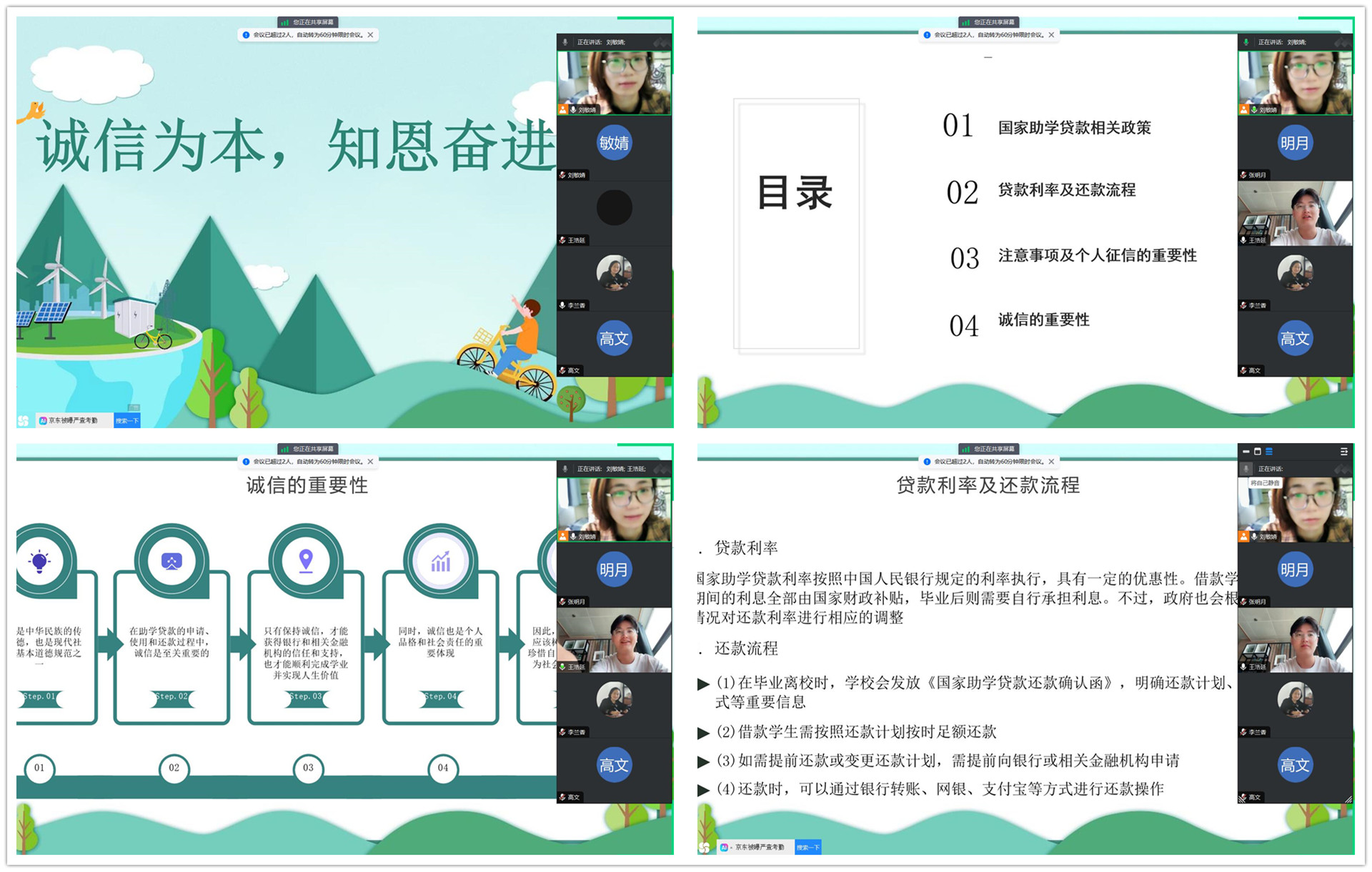 为进一步增强毕业生的诚信意识和责任意识,加强毕业生对助学贷款政策的了解,确保他们毕业后能够按时、足额地偿还贷款,维护个人信用记录,5月27日,电子与信息技术系在线上开展毕业生诚信教育活动。活动由辅导员刘敏婧老师主持。