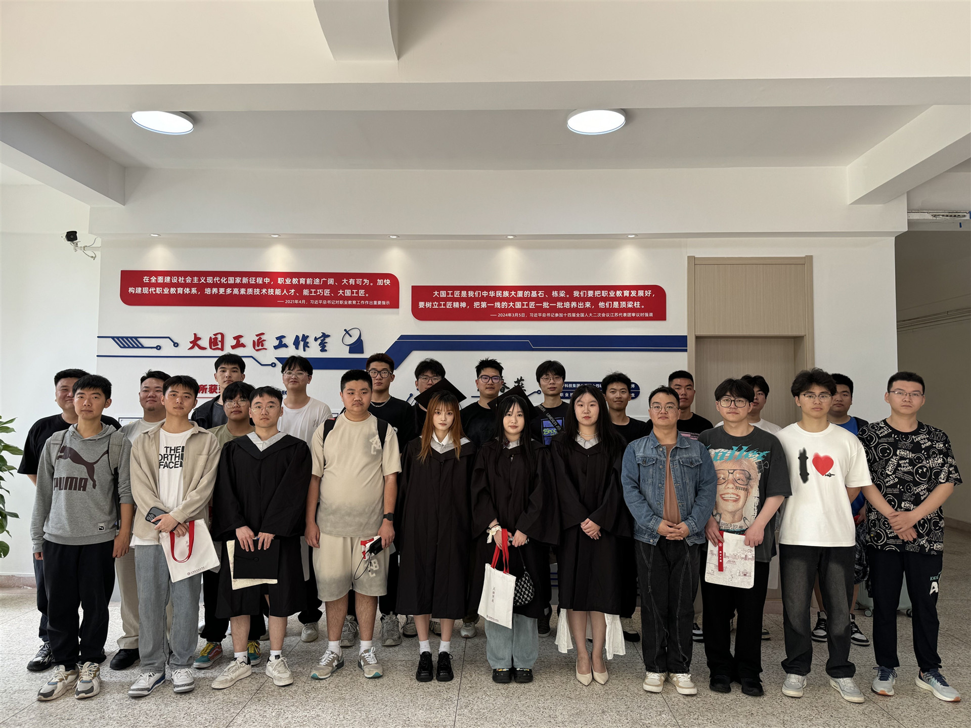 全体2024届毕业生代表在辅导员老师的带领下参观了顾春燕大国工匠工作室并合影留念,这一刻,他们脸上洋溢着灿烂的笑容,眼中闪烁着对未来的憧憬和期待。随着快门声的响起,这一美好瞬间被永远定格在了照片上。2024届优秀毕业生戴立志同学表示,通过参观顾春燕工作室,更加坚定了自己用好电子信息技术、投身于国防军工事业的决心。