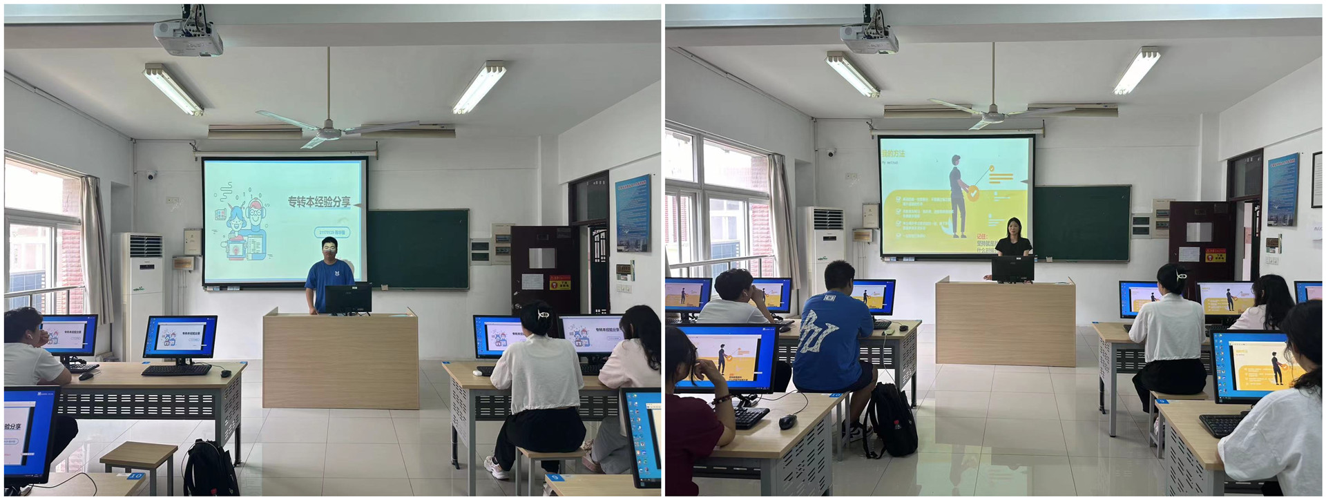 为弘扬优良学风、营造浓厚的学习氛围,帮助学生了解专转本政策以及学习方法,6月6日,电子与信息技术系在6305教室举办专转本经验交流分享会。本次活动由辅导员何华智主持,邀请2024届优秀毕业生吴婷婷、陈华强参加。