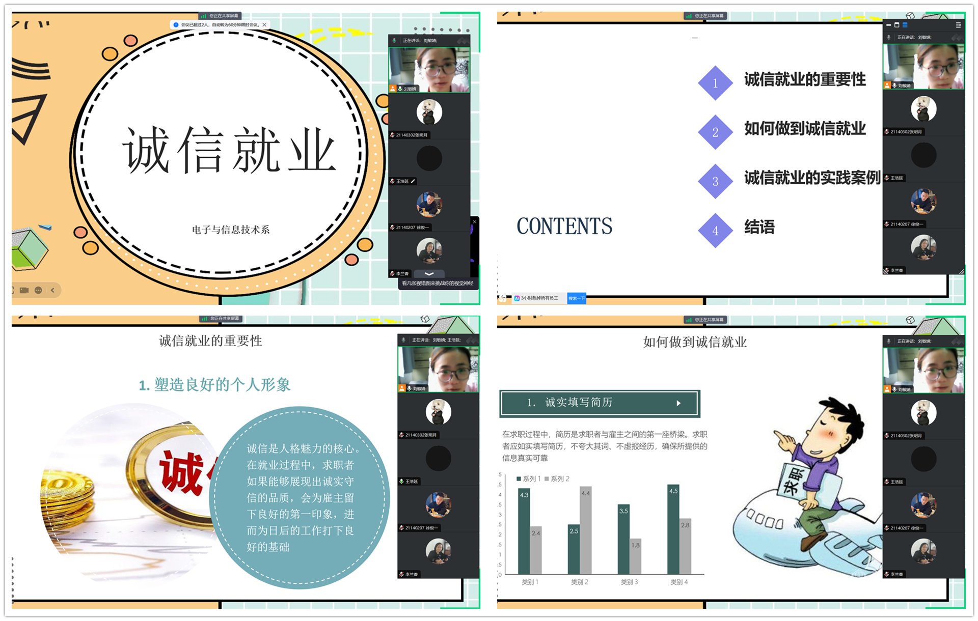 为加强学生的诚信意识,提升职业道德水平,电子与信息技术系于6月5日通过腾讯会议在线上开展了“诚信就业”主题教育活动。本次活动旨在引导学生树立正确的就业观,培养良好的职业道德,为其未来的职业生涯奠定坚实基础。