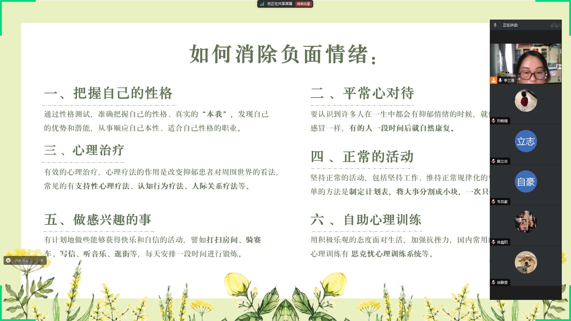 本次活动,李兰香老师积极准备,精心筹划,她结合自身工作经验和心理健康方面知识,向同学们介绍了在假期这个特殊时期心理健康的重要性、常见心理问题的应对方法以及有效的心理调节技巧,引导同学们认识心理健康问题的重要性,帮助学生消除不良情绪以及找到适合自己的情绪调节方法,培养学生良好的心理适应能力和积极健康的良好心态。