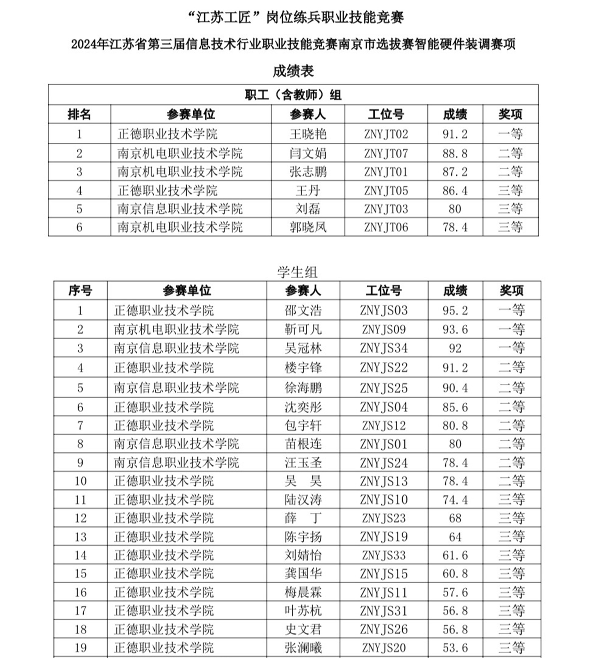 2024年10月13日,我院电子与信息技术系师生在南京工业职业技术大学参加了“江苏工匠”岗位练兵职业技能竞赛活动——2024年江苏省第三届信息技术行业职业技能竞赛南京市选拔赛。经过激烈角逐,我院代表队在智能硬件装调赛项中分别斩获教师组一等奖(第一名)1项、三等奖1项,学生组一等奖(第一名)1项、二等奖4项和三等奖9项。