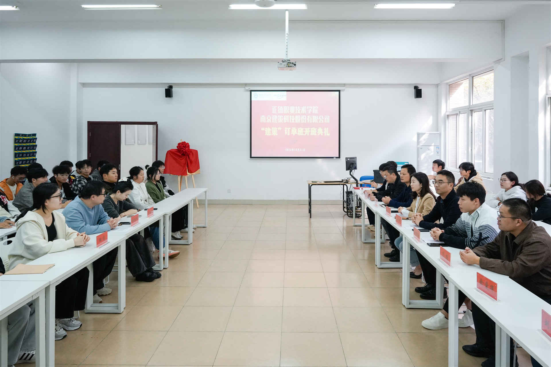 南京建策科技股份有限公司副总经理张林炜、总经理助理刘佳佳,市场部经理陆苗,学院院长助理、365英国处处长王墀、365英国处副处长张智灏,电子与信息技术系主任刘佳、副主任张宝华、计算机网络技术专业负责人张韬,专任教师余爱华、李俊、李红艳、辅导员刘敏婧,以及建策订单班全体同学共同见证了这一重要时刻。仪式由张韬主持。