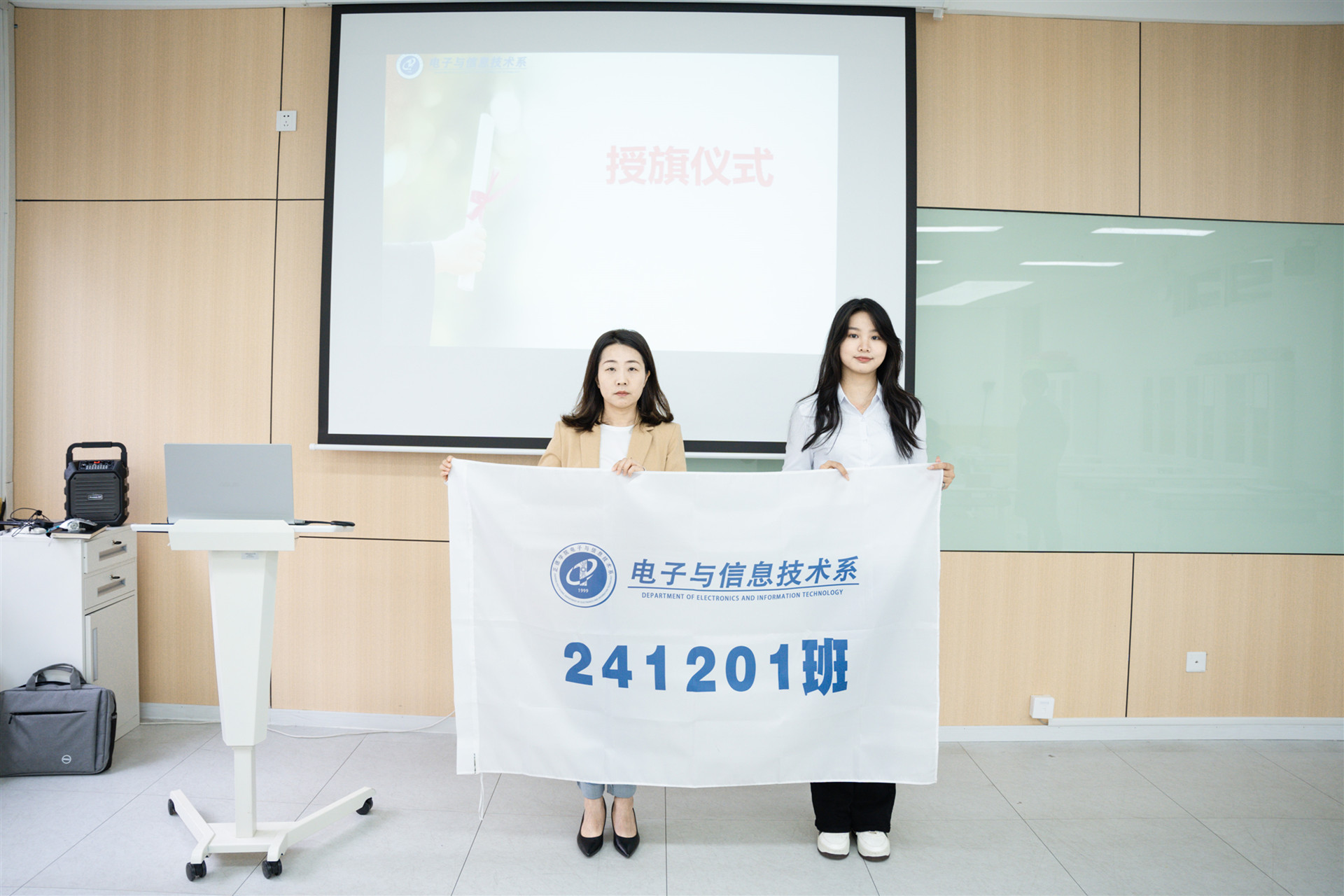 仪式伊始,由刘佳向学生代表唐语涵授241201班班旗,象征着“3+2”专本贯通培养班正式启航。