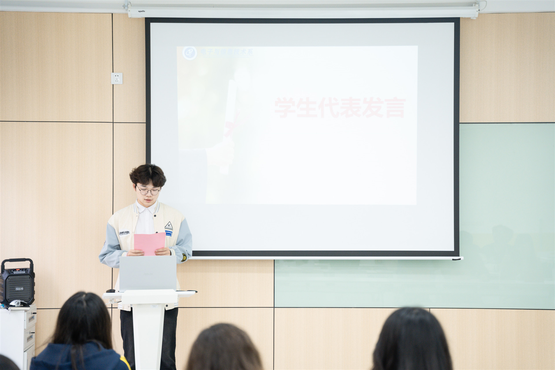 刘佳主任在致辞中对全体“3+2”专本贯通培养班的学生表示欢迎和祝贺。她简要回顾了电子信息工程技术专业的发展历史和特色建设,强调了“3+2”专本贯通项目为学生搭建了一个从职业教育向更高层次教育迈进的崭新平台。她勉励同学们,要以积极的态度和饱满的热情投入到学习和生活中,不断提升理论素养和创新能力,为未来的职业发展打下坚实基础。