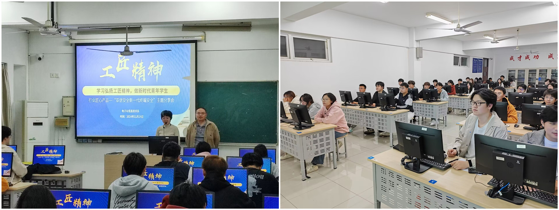 为了进一步增强学生们的行业认知,紧跟当前技术趋势的步伐,11月14日,电子与信息技术系邀请亚信安全科技股份有限公司举办“学习工匠精神”专题讲座。亚信安全终端安全产品资深技术架构师孙中轩、电子与信息技术系专任教师李红艳以及2024级学生参加活动。
