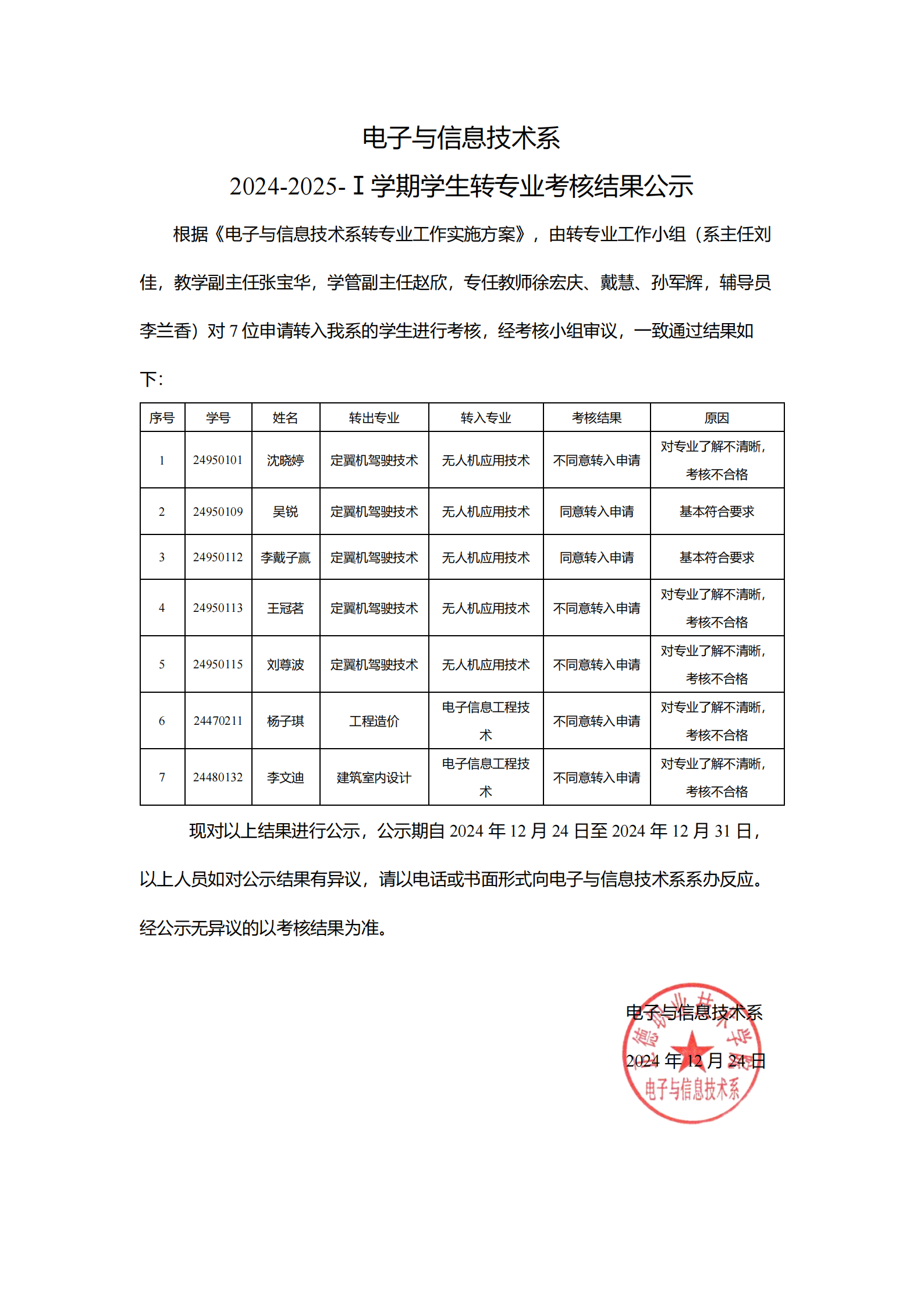 公示-电子与信息技术系2024-2025-I学期学生转专业考核结果公示