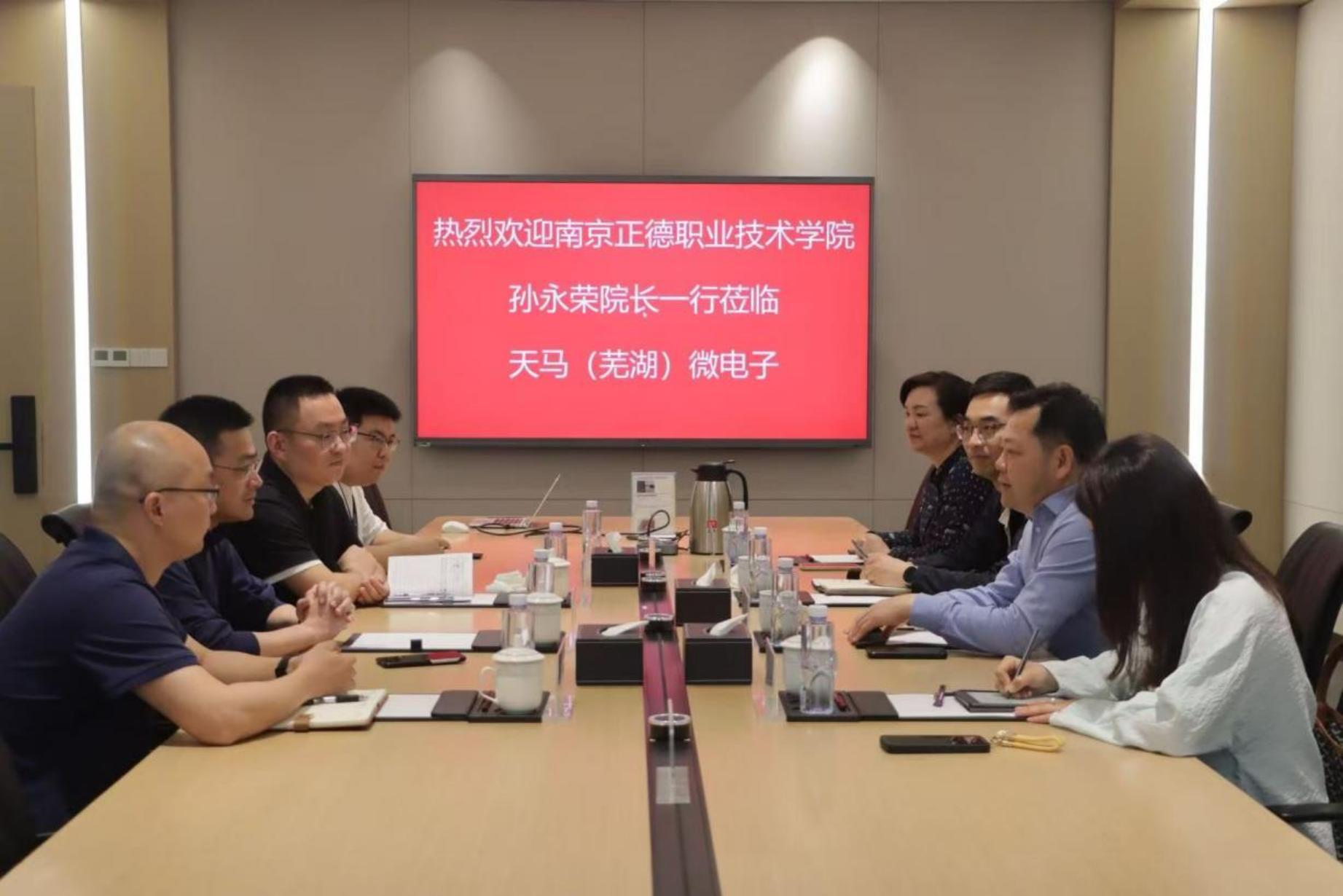继4月11日下午,天马(芜湖)微电子有限公司(以下简称“天马(芜湖)”)董事长李鹏来校交流后,4月18日上午,孙永荣一行受邀来到天马(芜湖)微电子有限公司开展调研,公司总经理缪周、人力资源部部长李虎、行政经理张俊、校企合作负责人荀旺等热情接待。交流会上,李虎从企业基本情况、开展的主要业务、实习生发展规划、工作环境与职工生活保障等方面介绍了天马的基本情况。