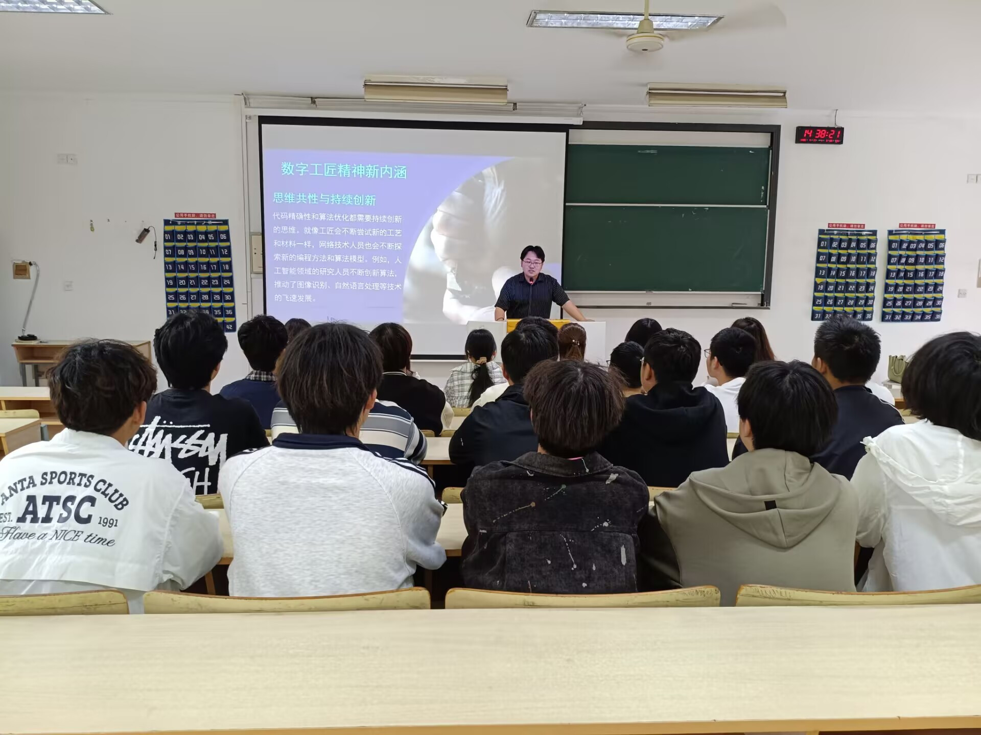 讲座上,曹辉紧扣电子信息工程技术专业实际,从编程领域切入,着重阐述“数字工匠精神”。他强调,作为未来的专业技术人才,同学们在代码编写与审查过程中,需以工匠般的严谨细致,逐行雕琢代码,确保程序在网络环境下稳定、高效运行,实现技术精度与速度的完美平衡。在探讨算法优化与创新时,他结合专业前沿发展指出,“思维共性是技术发展的核心动力”,鼓励同学们像工匠钻研技艺一样,不断探索新算法、新模型。他以人工智能领域为例,分享研究人员如何通过算法创新,推动图像识别、自然语言处理等技术在电子信息工程中的应用突破。此外,讲座还聚焦人工智能伦理议题,引导学生树立“技术向善”的理念,在未来专业实践中,用责任意识与人文关怀为科技发展护航。
