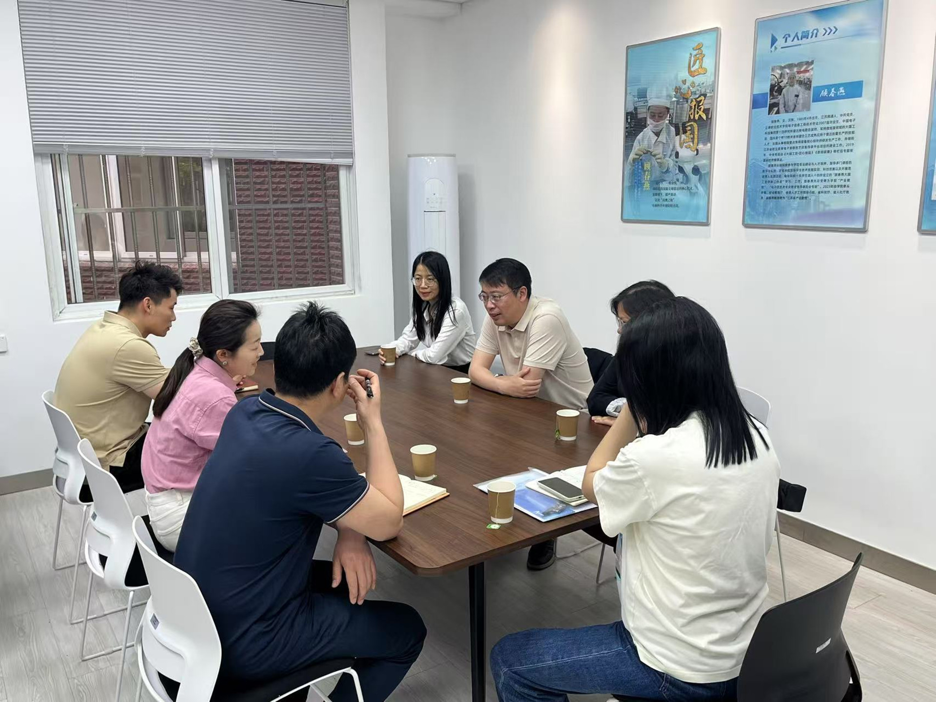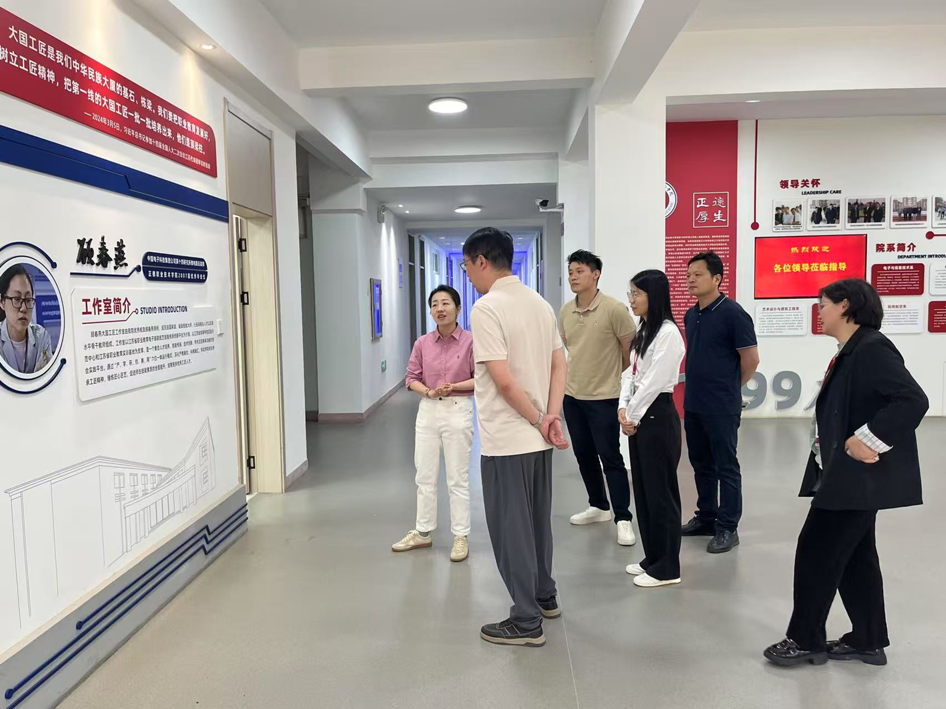 刘佳对国兆光电一行的到来表示热烈欢迎,并陪同参观了“大国工匠”工作室、无人机实训中心、科沃斯扫地机器人产品测试中心等教学实践平台。随后,双方在会议室举行座谈,就人才培养、实习实践、校企合作等内容进行了深入交流。