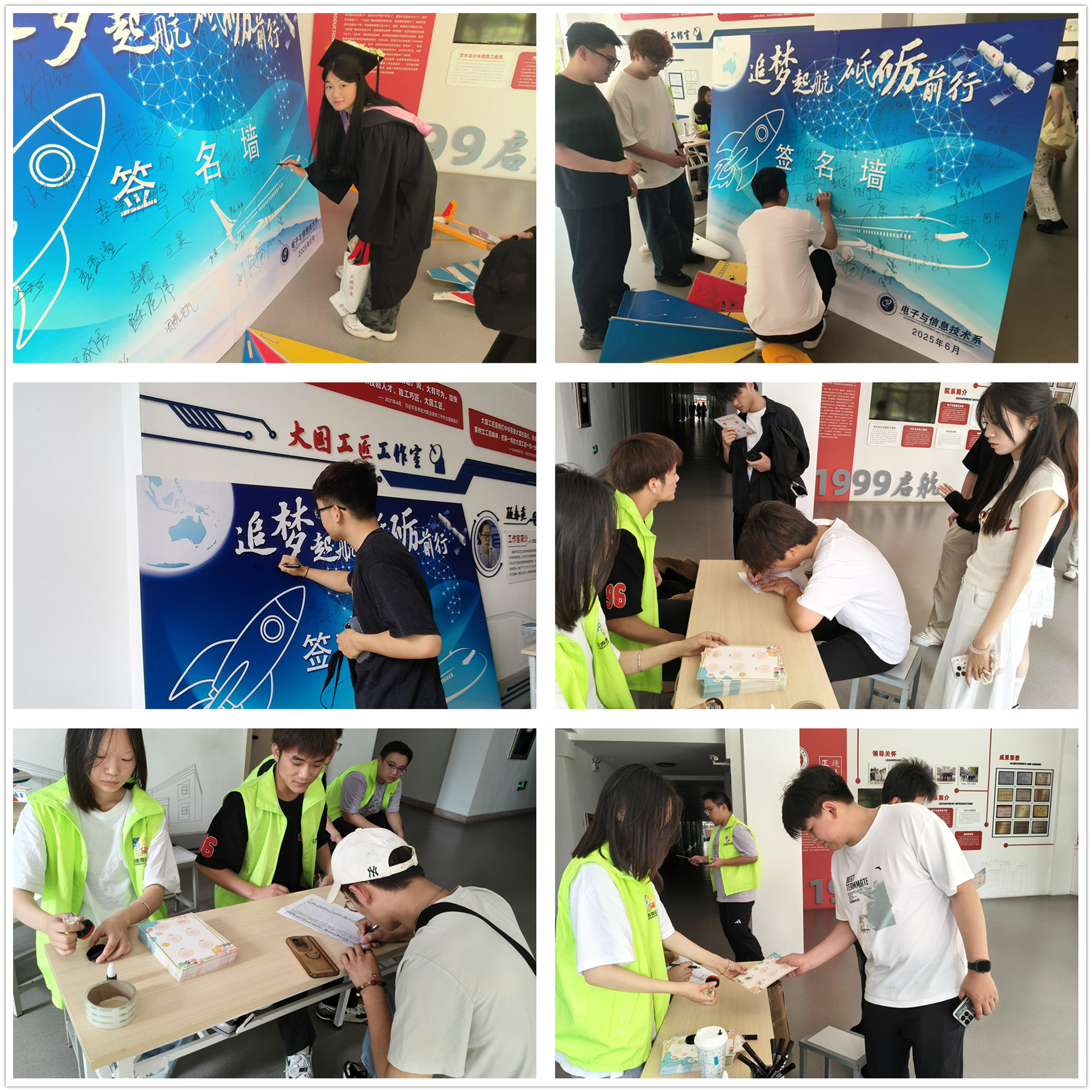 走进电子与信息技术展位,一面承载着特殊意义的签名墙映入眼帘。毕业生们纷纷拿起笔,在印有航天图案的签名墙上郑重地签下自己的名字,或刚劲有力,或娟秀飘逸。笔尖划过纸面的沙沙声,仿佛是他们与母校、与这段难忘青春岁月的深情对话。这些凝聚着回忆与期待的名字,既是他们在校园里拼搏奋斗的生动印记,更是他们迈向人生新征程的无畏宣言。