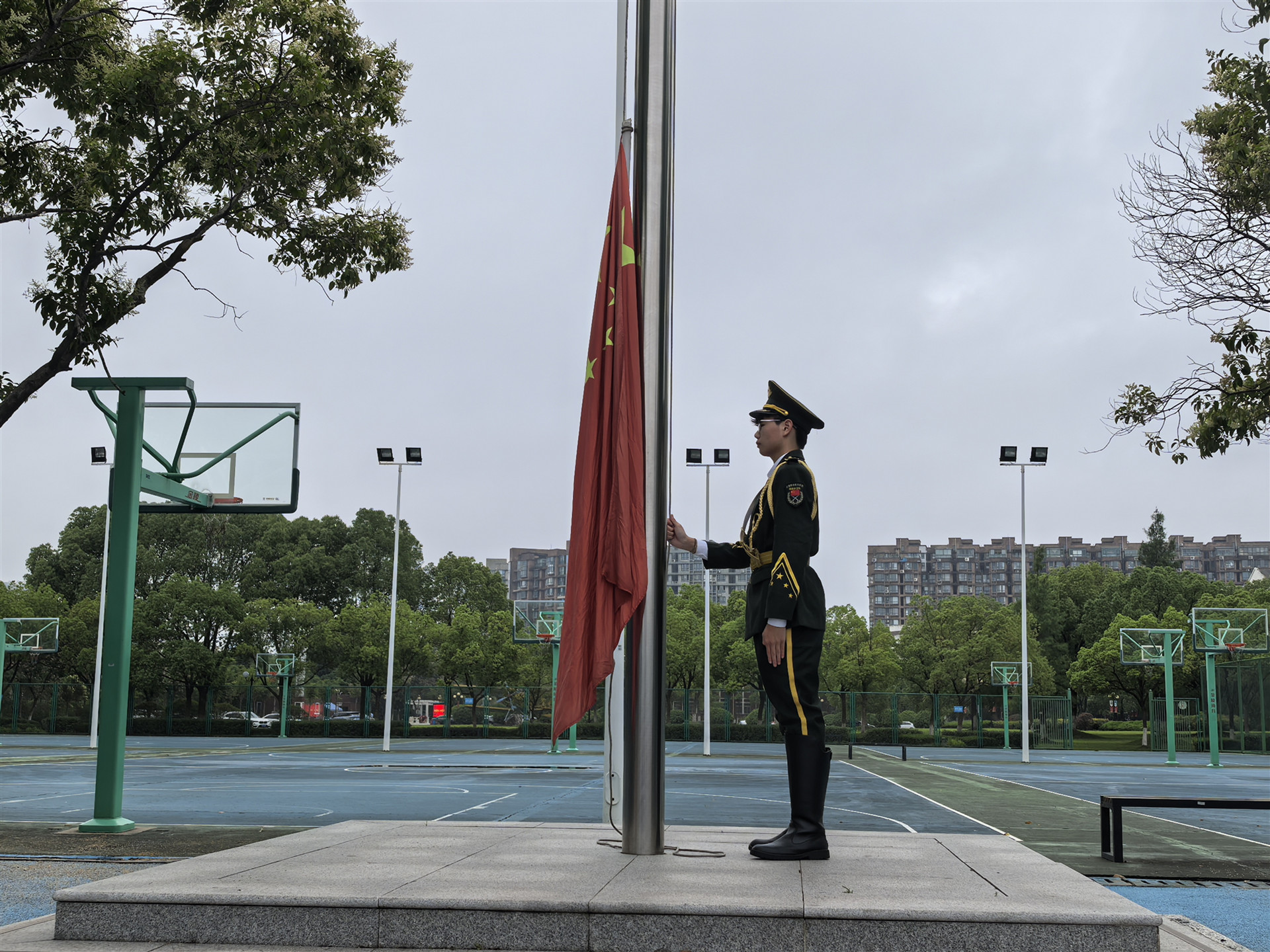 7时30分,升旗仪式准时开始。国旗护卫队员身姿挺拔,肩扛五星红旗,迈着铿锵有力的正步走向升旗台。当《义勇军进行曲》响起,鲜艳的五星红旗在晨风中舒展,伴随旋律缓缓升起。全体师生肃立凝神,目光紧追那抹鲜红,现场氛围庄严肃穆。