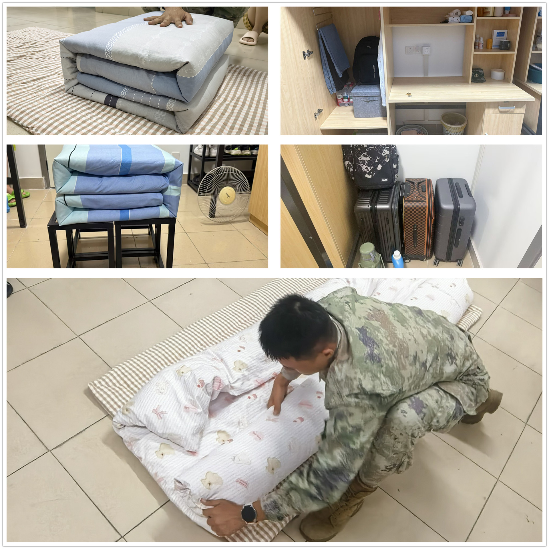 除了户外军事训练,内务整理也是军训的重要一课。在教官们的带领下,新生们认真学习叠“豆腐块”被子,从铺平被面、捏出棱角,到对齐边角、整理细节,每一步都一丝不苟;同时,大家还共同规范物品摆放,让书本、衣物、洗漱用品各归其位,在亲手打造整洁宿舍环境的过程中,培养严谨细致的生活习惯。