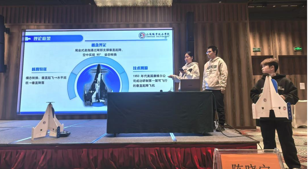 本次大赛,我院航模队参加了电动滑翔机和科技创新评比两个赛项。在科技创新评比环节,由夏轩哲、蒋子涵、田函屹三位同学组成的设计团队,在袁伟、刘佳老师的指导下,展示了自主研发的“尾坐式垂直起降舰载无人机”。这一设计不仅体现了对前沿技术的理解,更展现出将理论知识转化为实践成果的能力。在答辩过程中,队员们条理清晰地阐述了创新设计理念与关键技术突破,以其扎实的专业基础和解决实际问题的能力赢得了评委的一致认可,最终荣获二等奖。