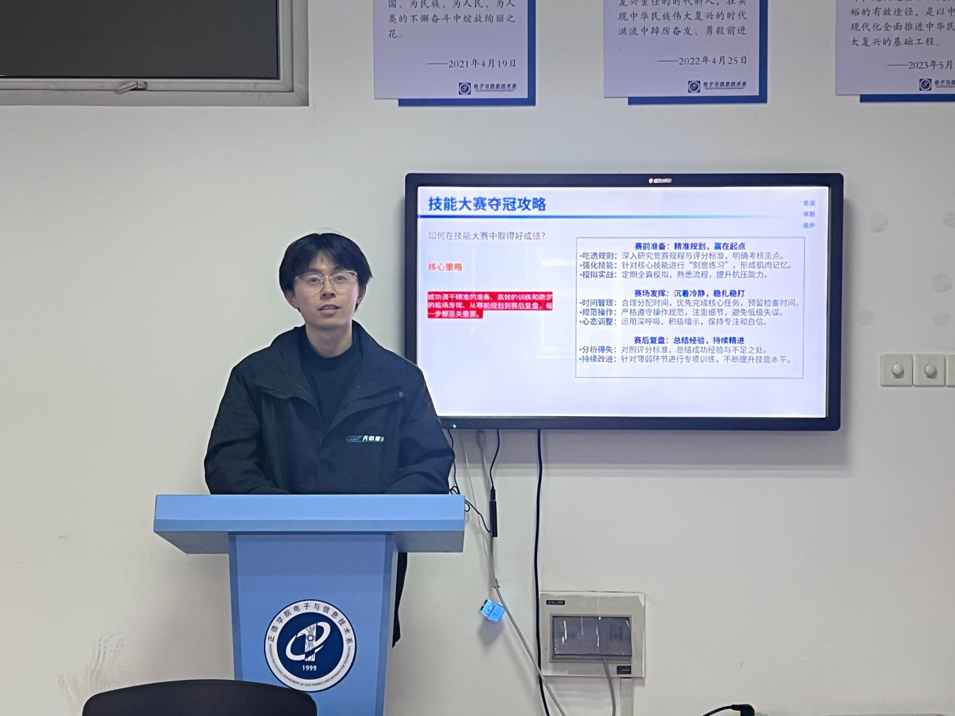 随后,钟奇结合自己在南京南暄禾雅科技有限公司的工作经历,向学弟学妹们介绍了机器视觉技术在工业智能化领域的前沿应用。他通过具体案例展示了机器视觉系统在生产检测、质量控制等环节的卓越性能,让同学们直观感受到技术赋能智能制造的强大动力。他强调,在校期间参与技能大赛所培养的创新思维和实践能力,为他快速适应岗位需求、参与企业技术研发奠定了坚实基础。他鼓励同学们要紧跟行业发展趋势,将所学知识与实际应用相结合,努力提升自身综合竞争力。