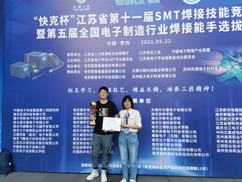为了培养江苏省电子装联技工的工匠精神,增进电子产品制造过程中的品质意识,搭建电子装联技术人员切磋技艺的平台。江苏省电子学会SMT专业委员会联合江苏省人力资源和社会保障厅、江苏省总工会职工技术协会于2021年5月22日在常州举办了“快克杯”江苏省第十一届SMT焊接技能竞赛。我院电子与信息技术系学生冯敬哲参加竞赛并荣获三等奖。