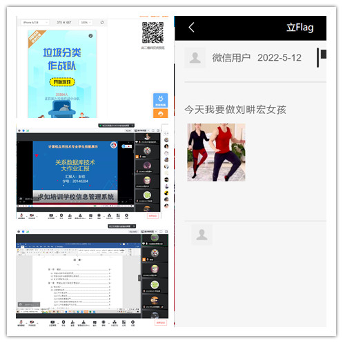 5月12日下午的展示活动由施莹老师主持,展示项目有“立FLAG”微信小程序开发设计”、“垃圾分类作战队”、“航拍视屏展”、“网页设计与制作”、“学校信息管理系统”、“马戏团”、“全自动智能小车”、“钢管智能检测系统”、“无人机远程喊话系统”、“智能运动手环设计、智能雨刷器控制系统、门禁系统”,按照顺序依次通过腾讯会议做了演示,全系280余名师生观看了此次展示。此次展示项目分为程序设计、网页制作、电子产品设计与制作等,涵盖电子与信息技术系的各个专业,多为学生的大创作品及优秀作业。学生通过PPT讲解和演示相结合的方式将自己的作品完美展示给大家。参加活动的学生充分感受到了“编程”的魅力,纷纷感叹科技改变生活。其中的“垃圾分类作战队”小程序尤其受到学生的喜爱,他们表示通过此类小程序既玩了游戏,又学到垃圾分类的知识,一举两得。