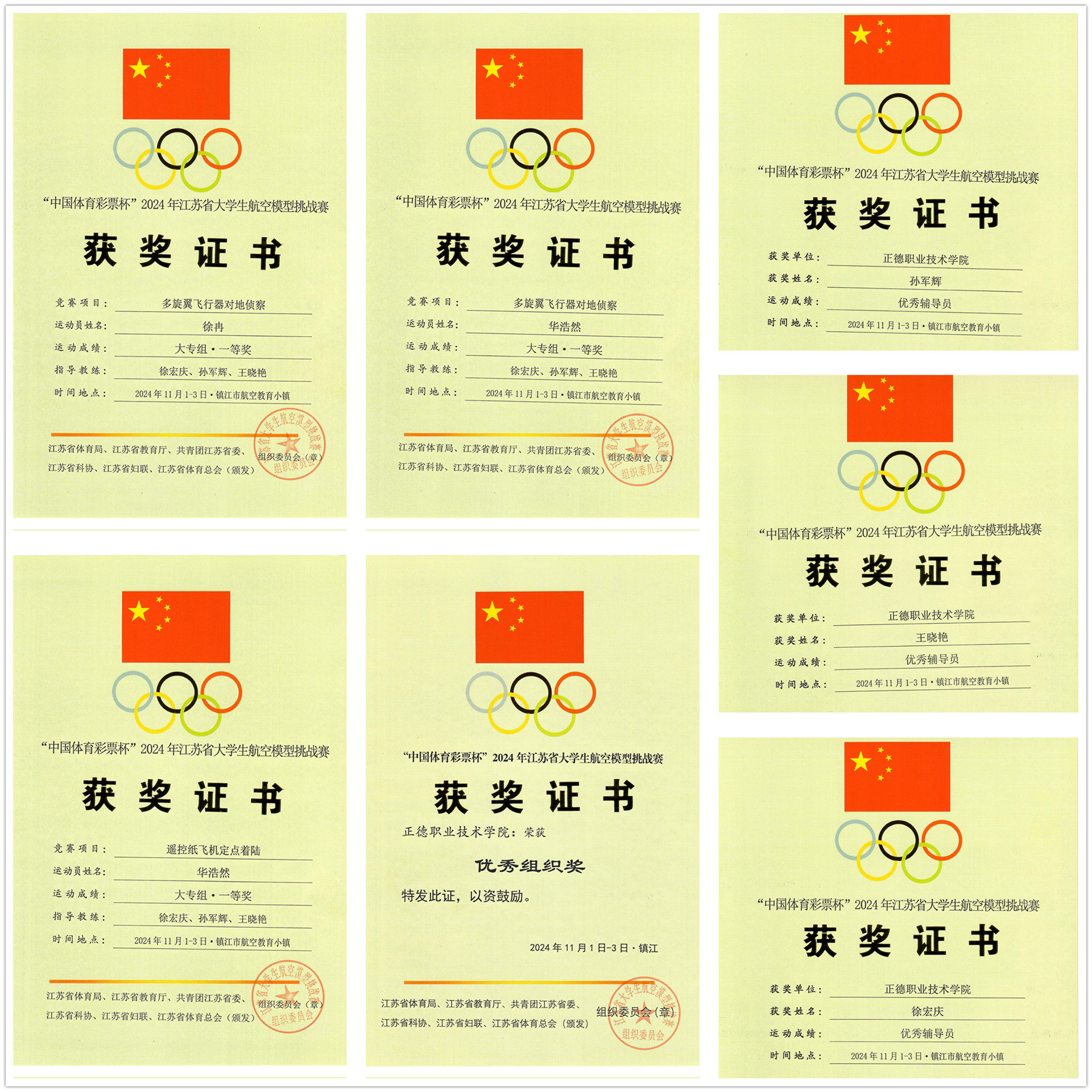 “中国体育彩票杯”2024年江苏省大学生航空模型挑战赛学生组获奖证书