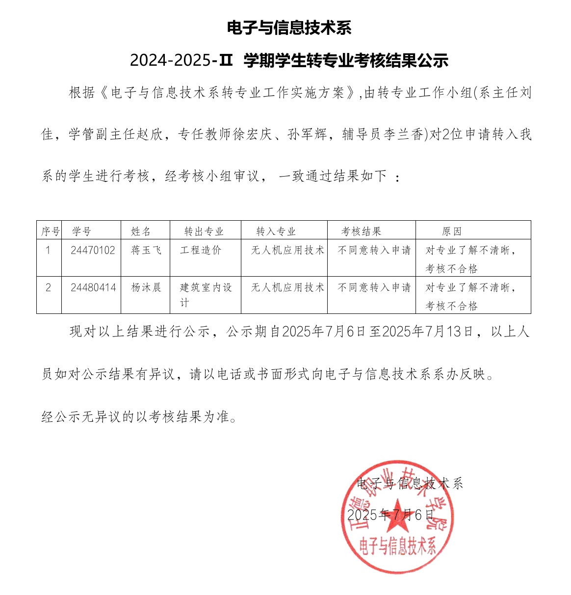 电子与信息技术系2024-2025-Ⅱ学期学生转专业考核结果公示