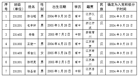 经党支部培养教育和考察,在听取党小组、培养联系人、党员和群众意见的基础上,经支委会2025年10月9日讨论,拟确定陈伯韬、包宇轩等7位同志为发展对象。根据发展党员工作有关要求,现将其有关情况予以公示(见附件)。