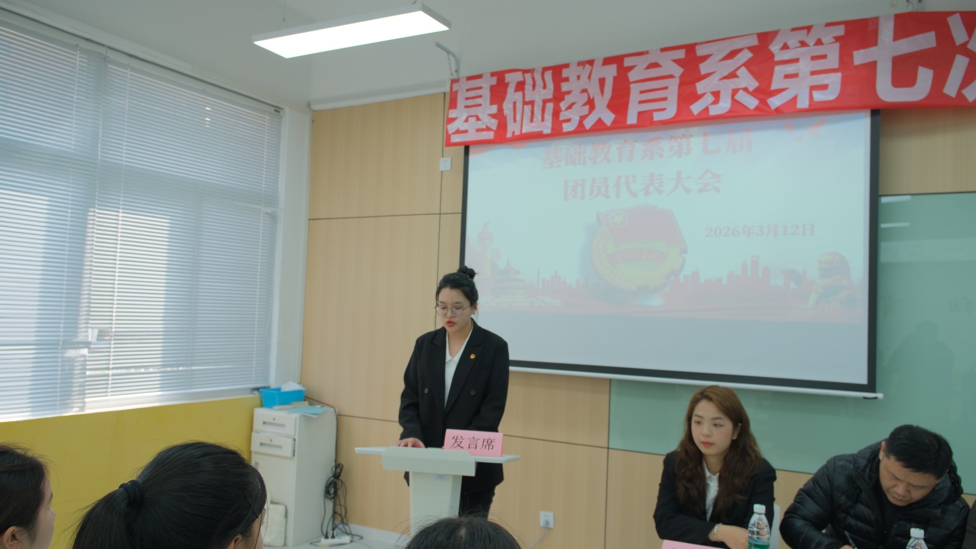 艺术设计与建筑工程系团总支书记王思思代表兄弟系随后致辞,对基础教育系第七次团代会的召开表示热烈祝贺。她指出,希望基础教育系团总支以本次大会为新起点,坚守初心使命,持续增强团组织的凝聚力与向心力,推动共青团工作提质增效。