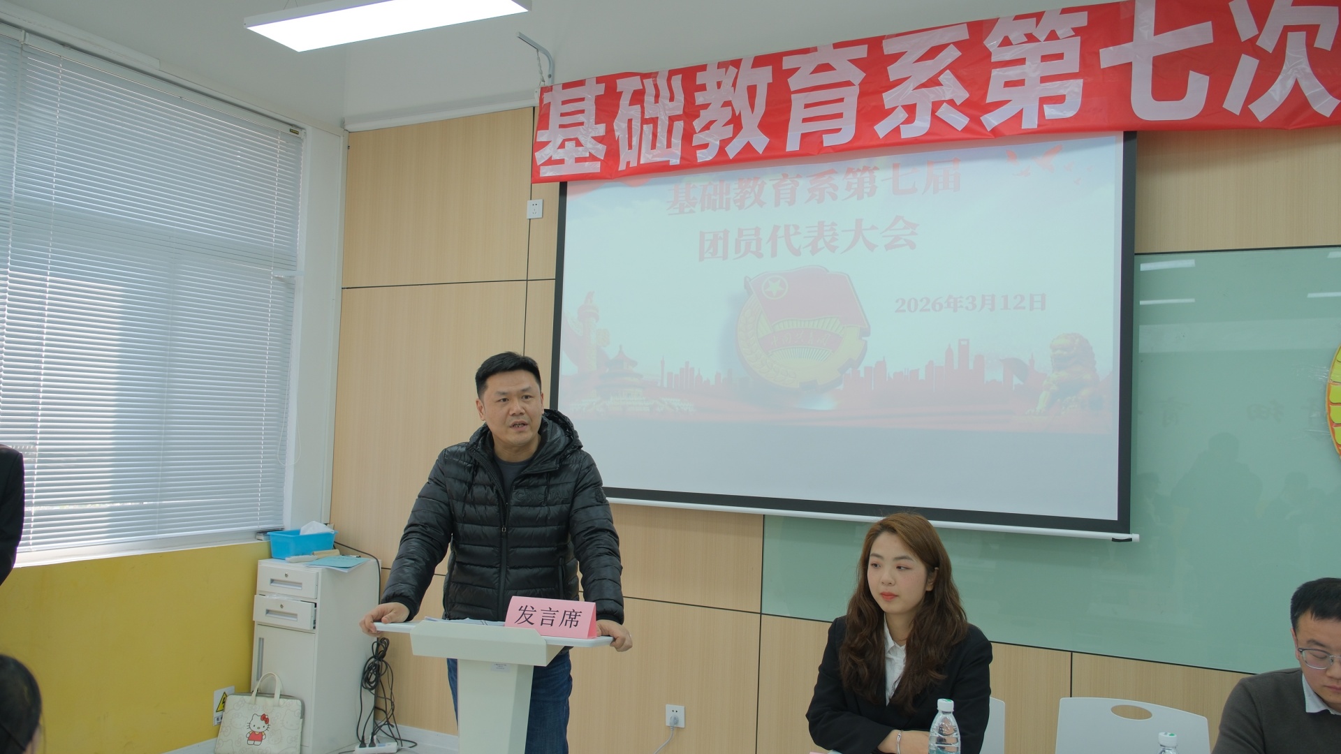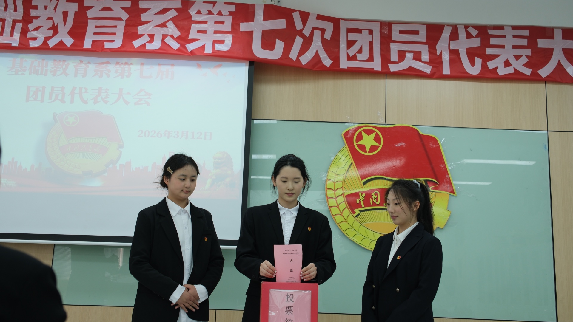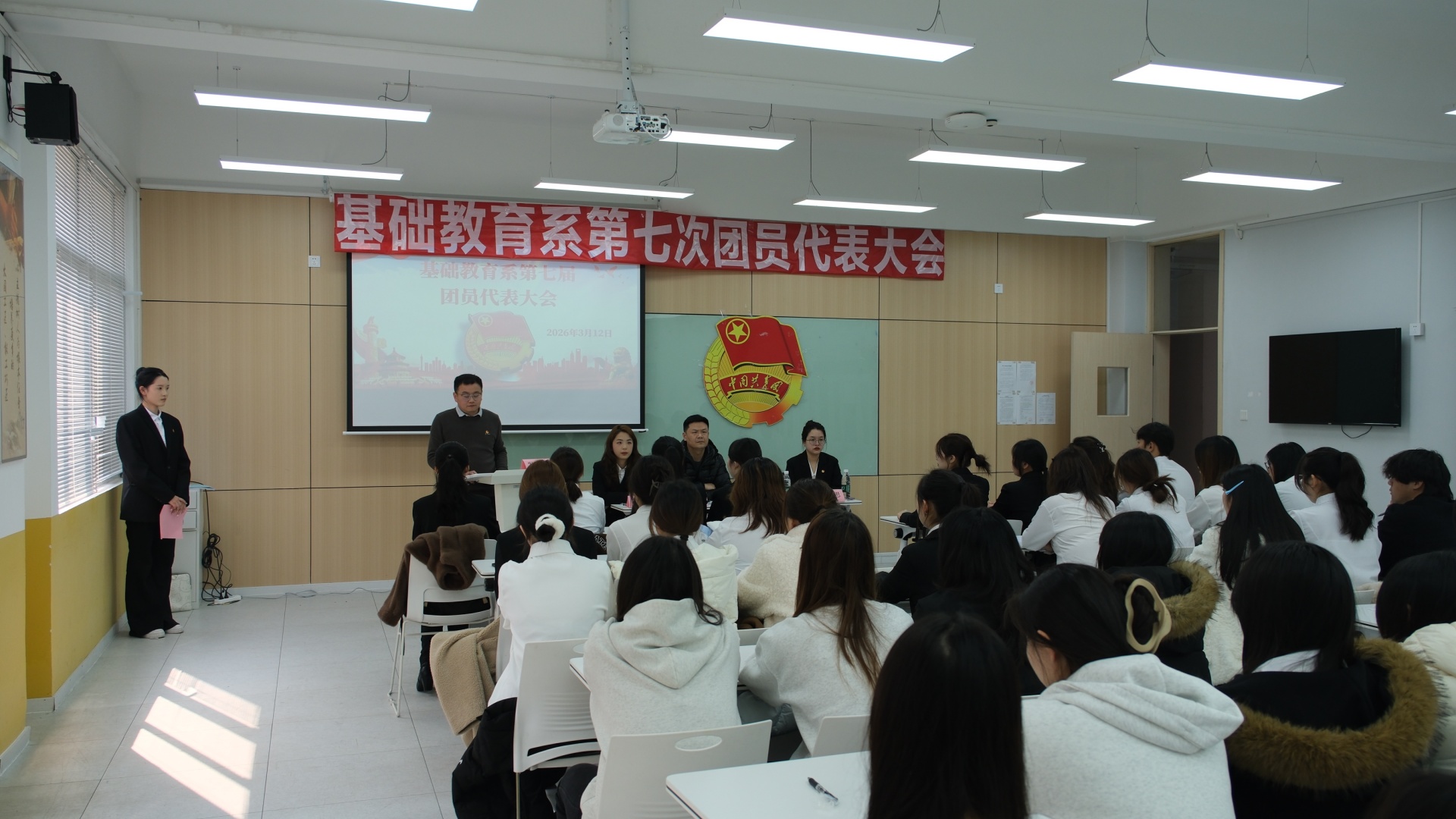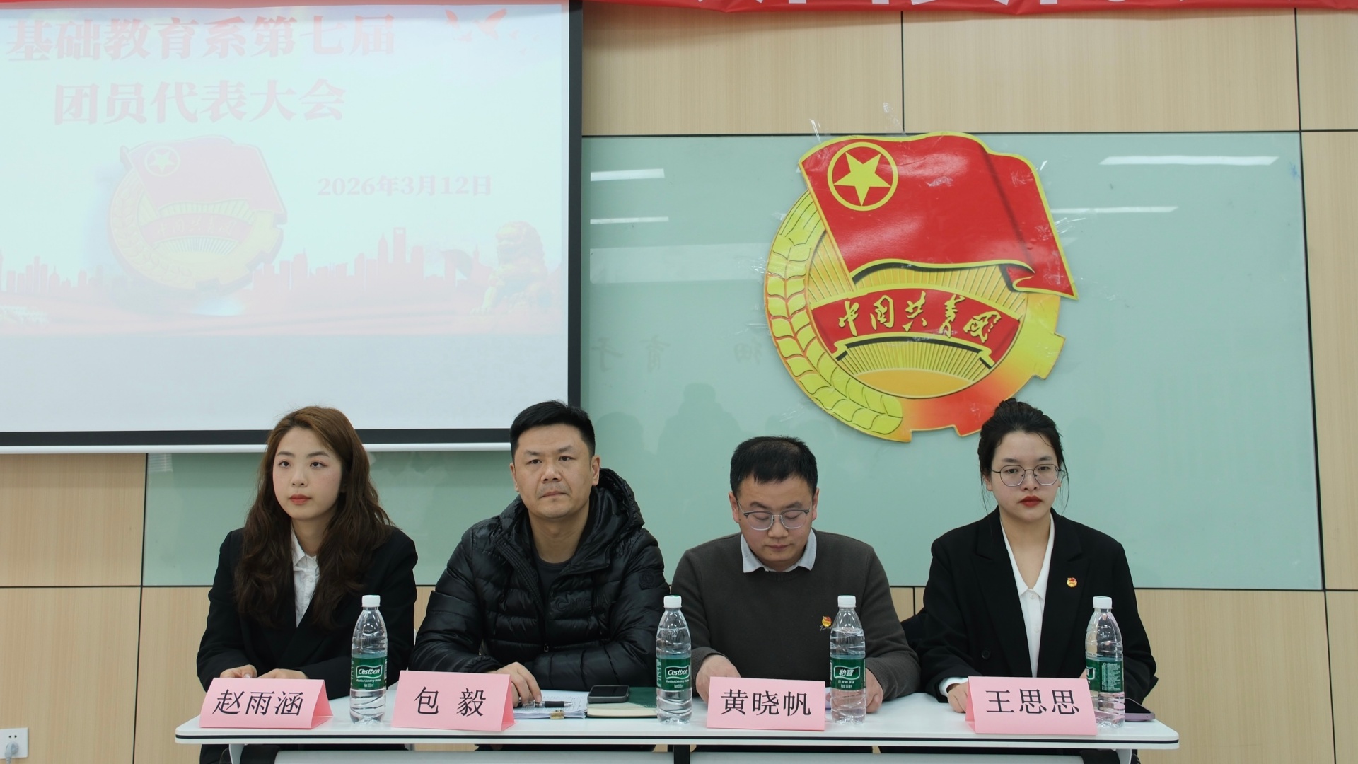 2026年3月12日,基础教育系第七次团员代表大会在9205会议室隆重举行。院团委书记黄晓帆、党支部书记包毅、团总支书记赵雨涵、以及兄弟系艺术设计与建筑工程系团总支书记王思思、全系50名学生代表齐聚现场。会议由基础教育系团总支学生干部陈雨轩主持。