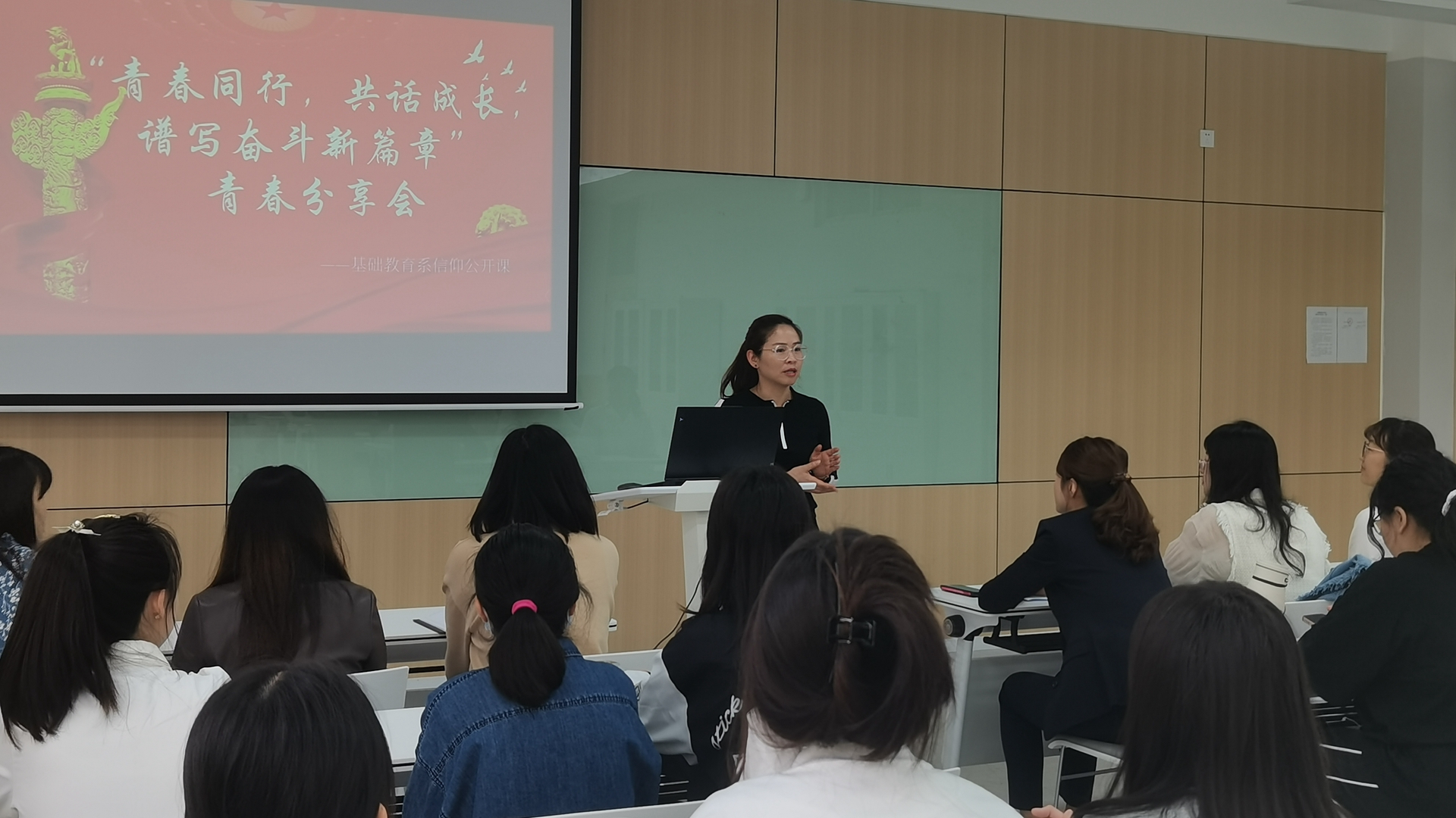 我系团总支创新信仰公课开展形式,特别邀请了秣陵街道翠屏社区的陈老师和何老师来校与我系学子共话青春,开展了一场青春分享交流会。首先,陈老师从自身工作讲起,作为一名基层社区工作者,在疫情期间,她主要负责社区人员排查、门岗管控、环境消杀、居家隔离户管控与服务等工作,讲述了青年一代的新生力量在社区抗疫前线的重要地位。除此之外,陈老师作为社区志愿者团队的负责人,2023年上半年就组织开展志愿服务活动50余次,内容涵盖社区宣传、文体活动、暑期课堂、心理辅导、环境治理、敬老爱老等方面。陈老师表示,要在平凡的岗位创造出不平凡的价值,勉励在座的同学要勤奋学习,不负青春时光。