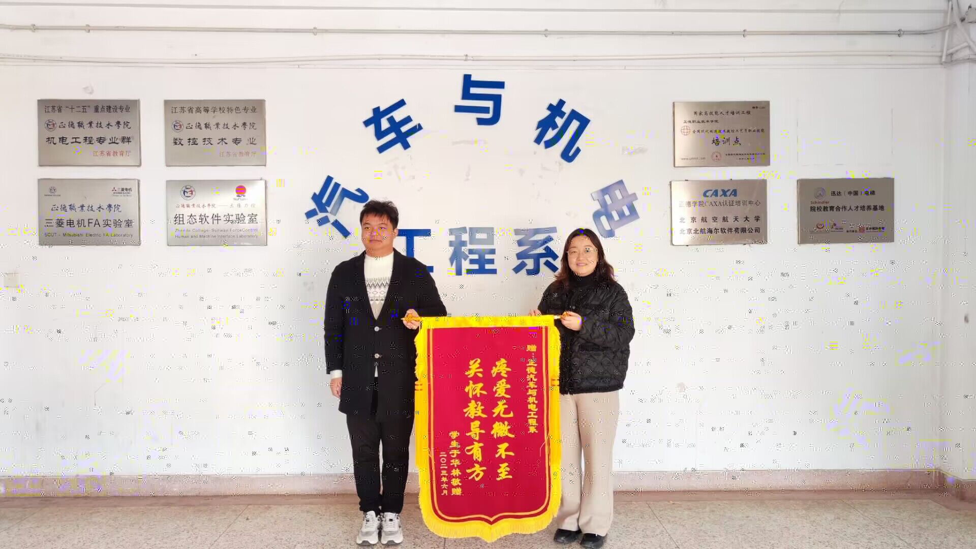 19级毕业生于华林同学曾经因在学校遇到个人原因,导致学习和生活上遇到困难。在辅导员,系部以及学生处的不断帮助下顺利毕业并成功专转本考入南京航天航空大学金城学院。为表达对学院和老师三年的辛勤培养与教育,于12月7日来校给学生处和汽车与机电工程系两个部门赠送锦旗。