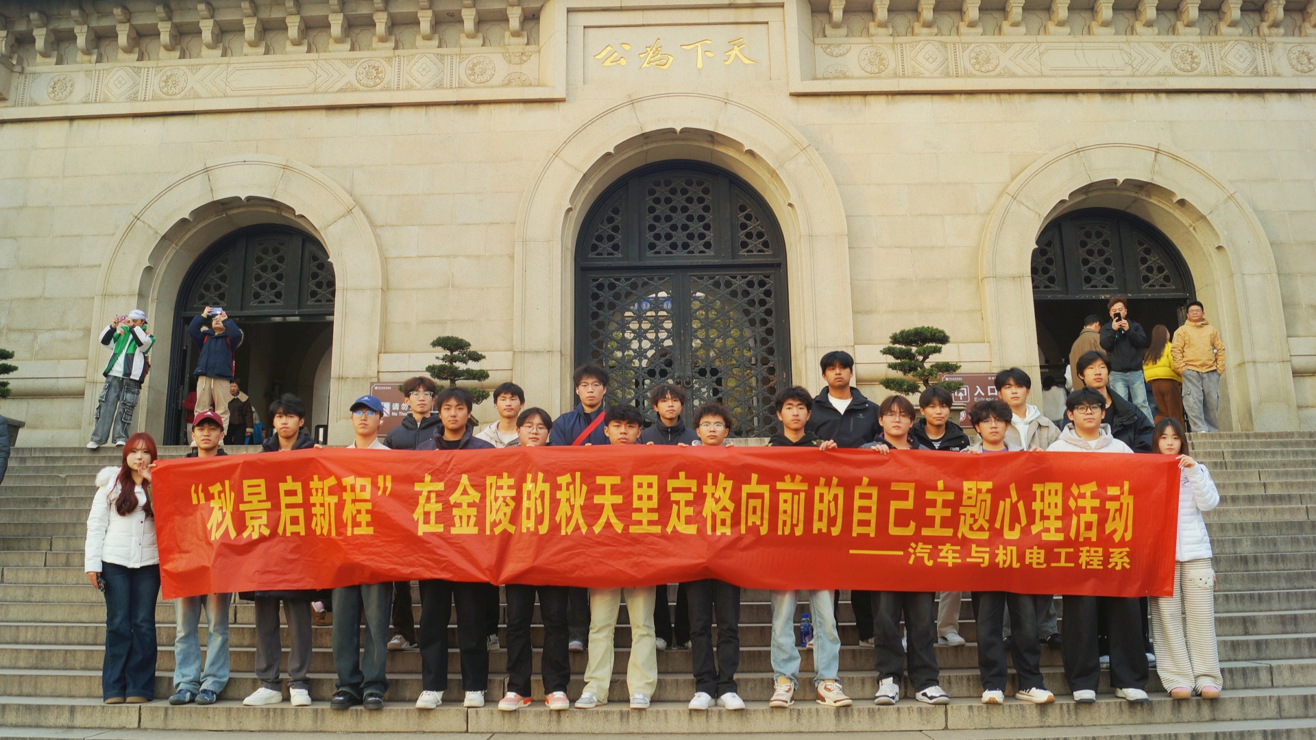 深秋的中山陵,梧桐叠翠流金,银杏洒落金黄,层林尽染之间更显庄重与宁静。同学们在辅导员和心理委员的带领下,有序步入景区,漫步于陵园大道、音乐台、灵谷寺等景点,一边感受秋日金陵特有的历史韵味与自然之美,一边结合活动主题进行创意拍摄与自我表达。此次“秋景启新程”心理活动,是汽车与机电工程系扎实推进学生心理健康教育工作、创新心理育人形式的又一次实践。活动将自然体验、审美教育与心理成长相结合,不仅有效缓解了学生的学业压力,增强了班级凝聚力,更深化了学生对自我成长与专业使命的认知。同学们在亲近自然、记录美好的过程中,沉淀了心境,明确了方向。